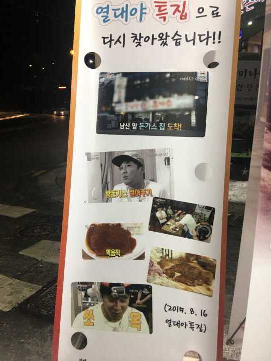 出来太冷了,简直饥寒交迫急急忙忙下山找吃的。没找到妮妮说的那个冷面店,朋友建议我去吃Running Man的猪扒饭---元祖南山王炸猪排(人均103rmb),[坑爹的导航教我从另一条超斜的路上去,斜到怀疑人生,其实隔壁有楼梯的(不过楼梯其实也只是斜坡钉防滑木条,雪融的时候还满滑的,周边很多涂鸦,就是从山下往上走一直走到尽头有一个涂鸦的拐角像楼梯的地方上楼梯就是),还有一点注意的是店在南山塔附近,不是大众点评的明洞店,可以直接用地图软件搜店名导航]。