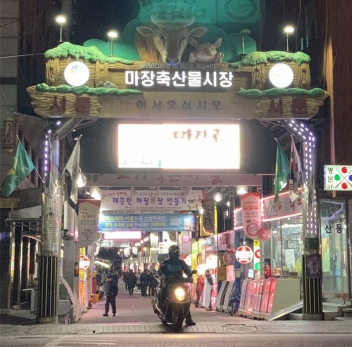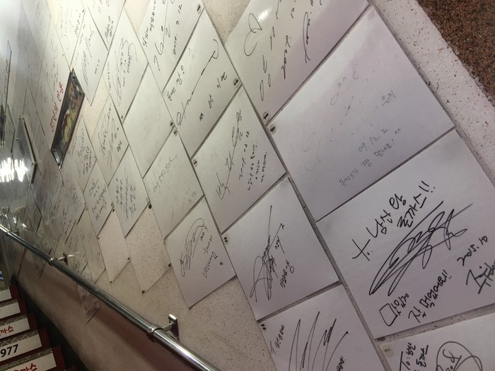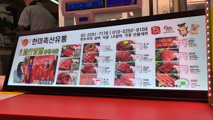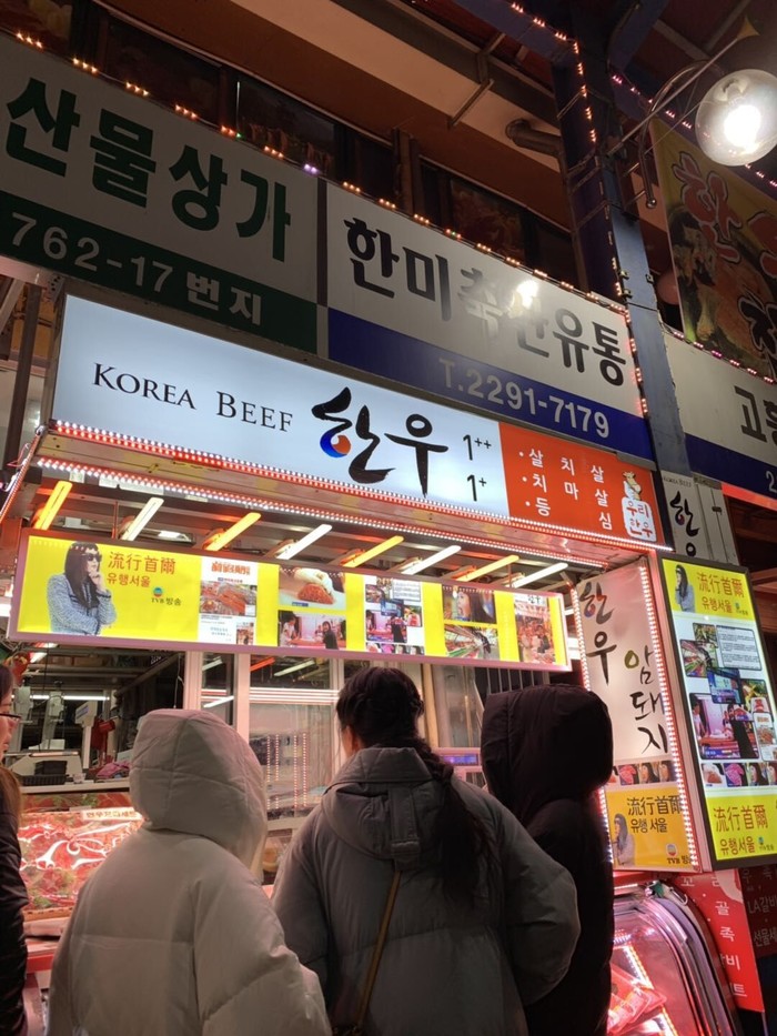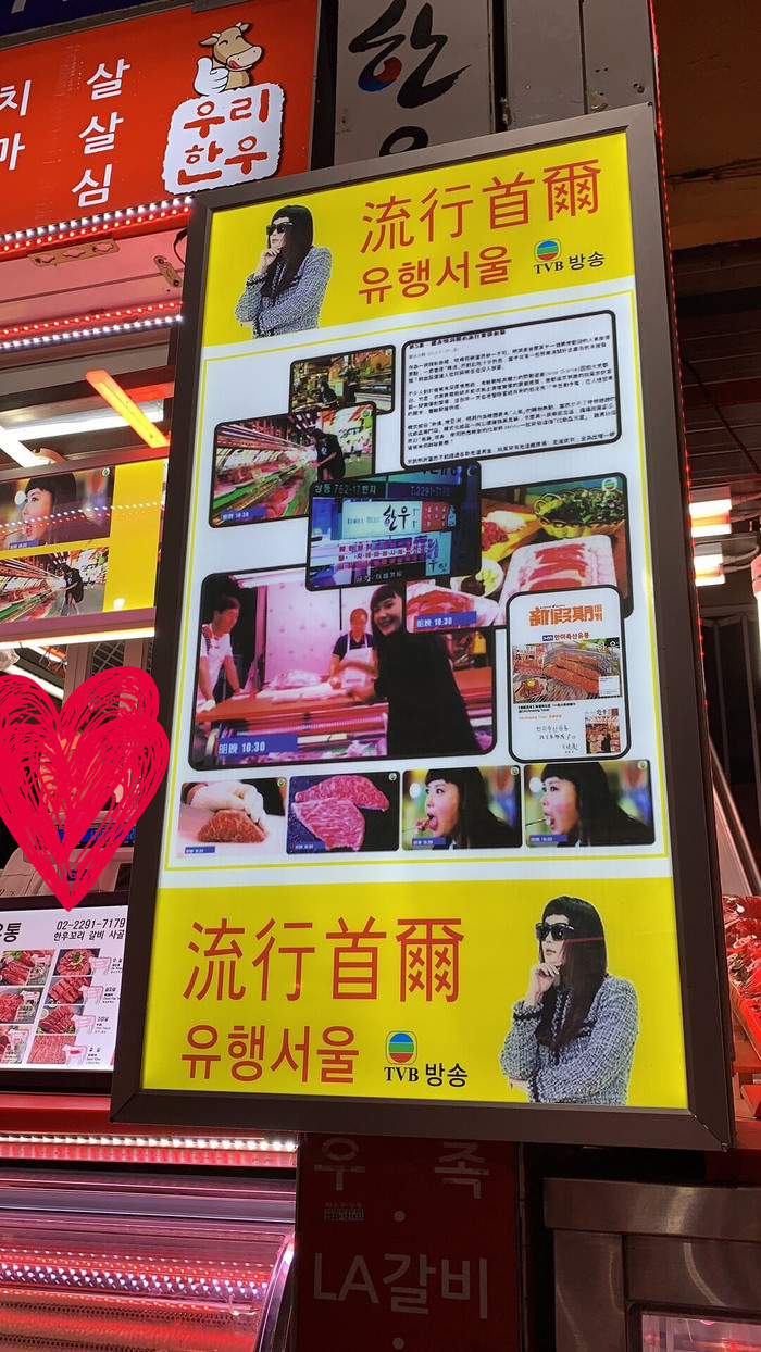 然后坐地铁出发去韩牛市场,[马场洞地铁站出来,途中有指示牌],找到杜如风当时拍摄的那间(有杜小姐的照片黄色的牌子很好认),很多港人也在。