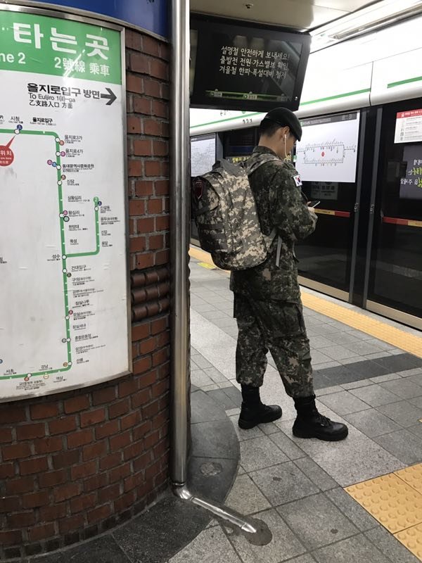 因为快过年了士兵都回家,在地铁站看到满多的,那时好像刚好在放太阳的后裔,真的都好高,头都要撞上旁边的站台电视了。