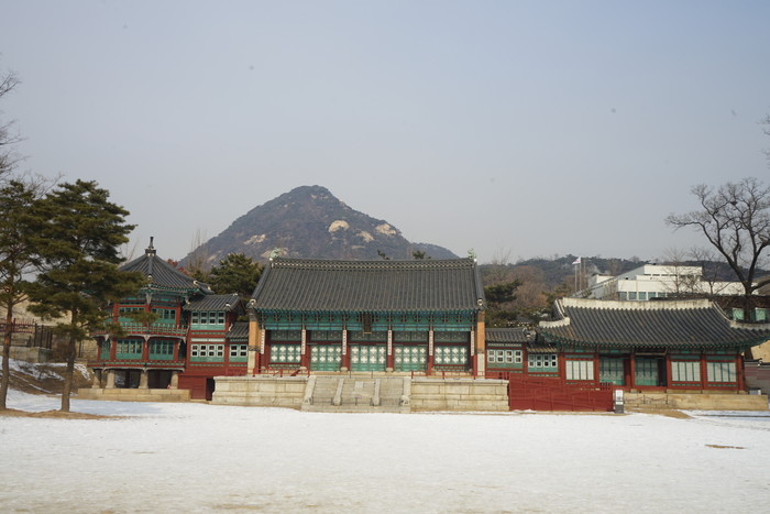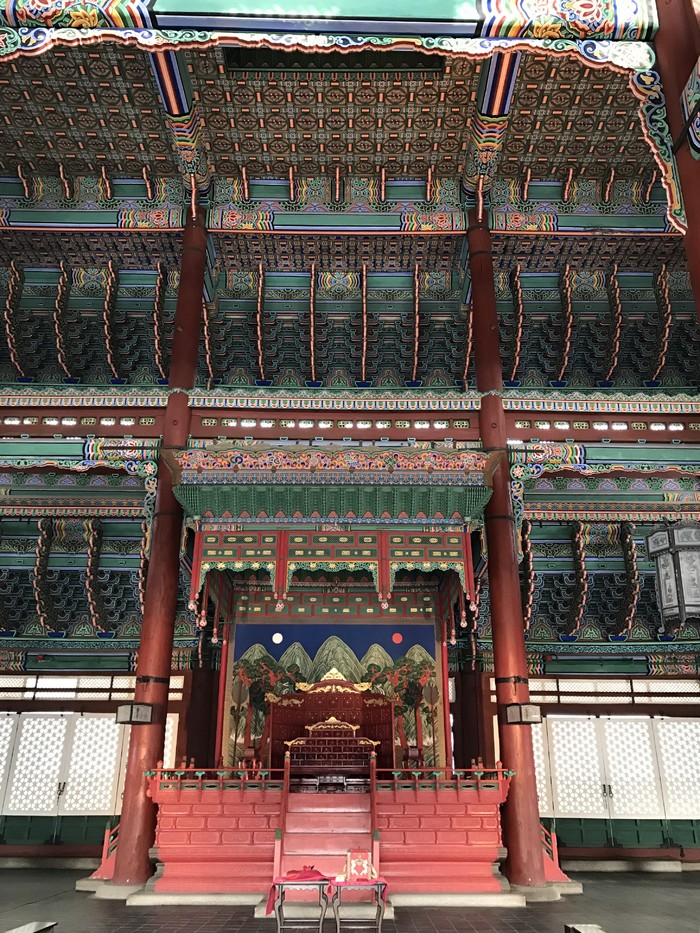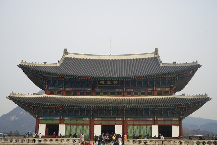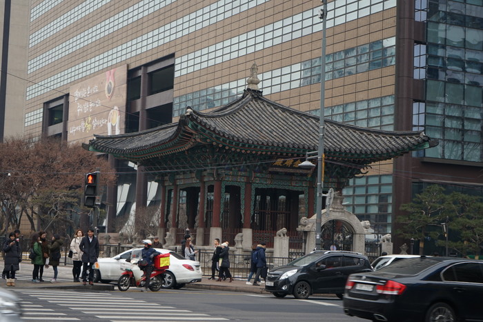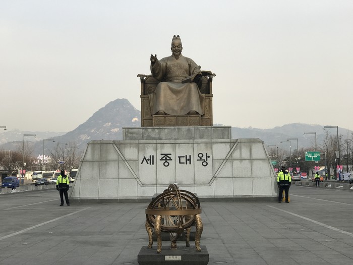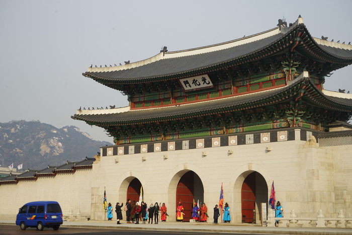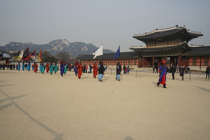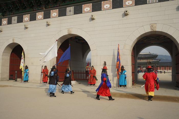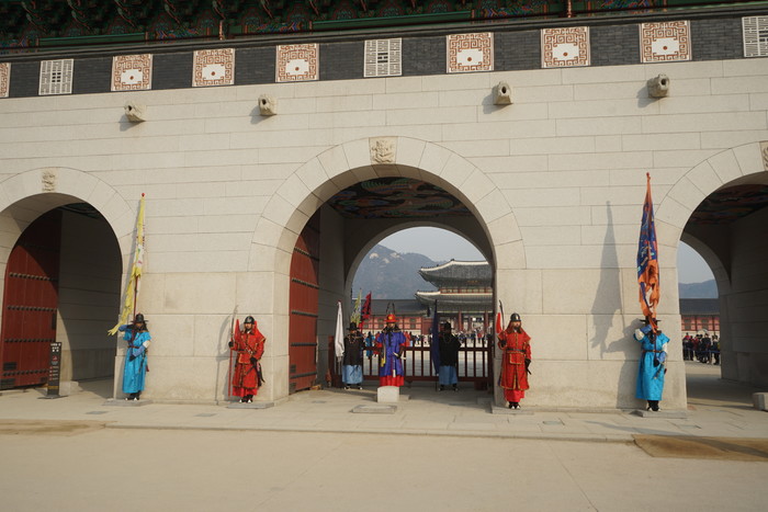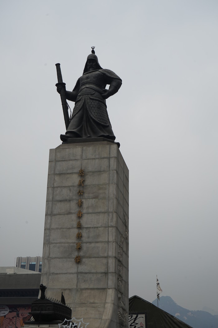 早上赶去景德宫(周二休息)10点有交接仪式,[地铁3号线景福宫站下车],出地铁站口跟着走出来就看到世宗大王,他对面就是李舜臣将军,大王背后就是光化门,门后就是景福宫, 将军背后那边是清溪川的方向。(将军背后那边很多帐篷应该是当时抗议朴槿惠,里面的人见到我们经过还跟我们说话,也是厉害,粤普日韩英还有菲律宾还是印尼话都能说,我们也害怕急急忙忙的走了)