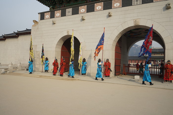 因为在大王前停留了拍照,所以已经10点了,飞奔过去光华门已经不能进了。想进去看可以提早点,不过再外面还是能看的,下午我们走的时候好像还有交换仪式,早上去看的记得找站门口中间的侍卫拍照,等我们出来后就不见了,下午仪式也比较简单,没看到站中间的侍卫。