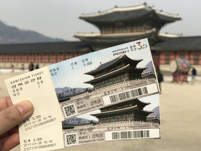 然后进门在右手边的地方买票(看其他攻略可以买套票去另一个皇宫和密院的),还能租中文讲解器,不过要压护照。可以去附近的店租韩服穿再到里面拍照。(门票+解说人均35rmb),10:00、12:30、14:30会有 免费中文导游,出发地点是弘礼门(正门)内的咨询处。