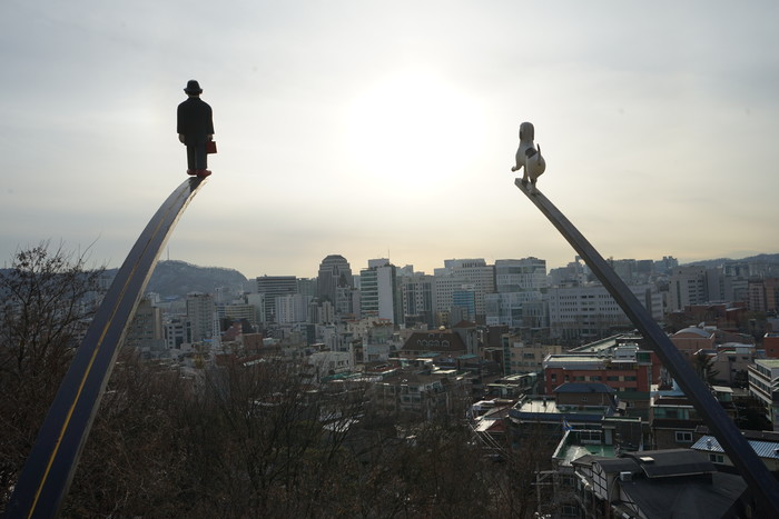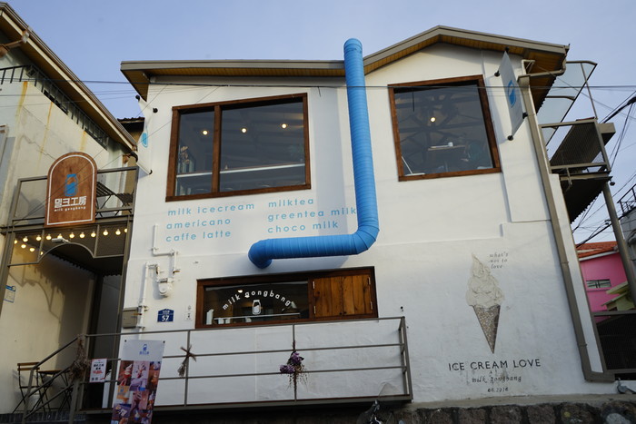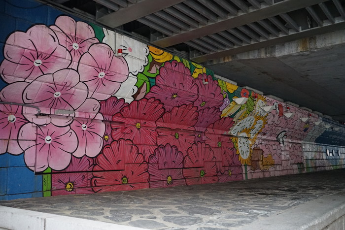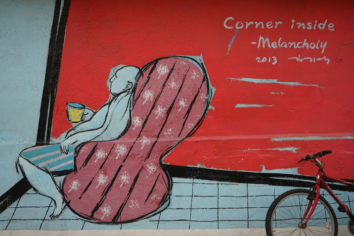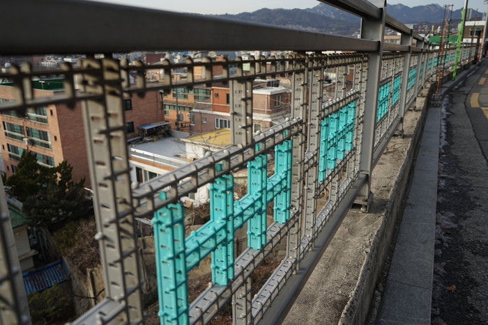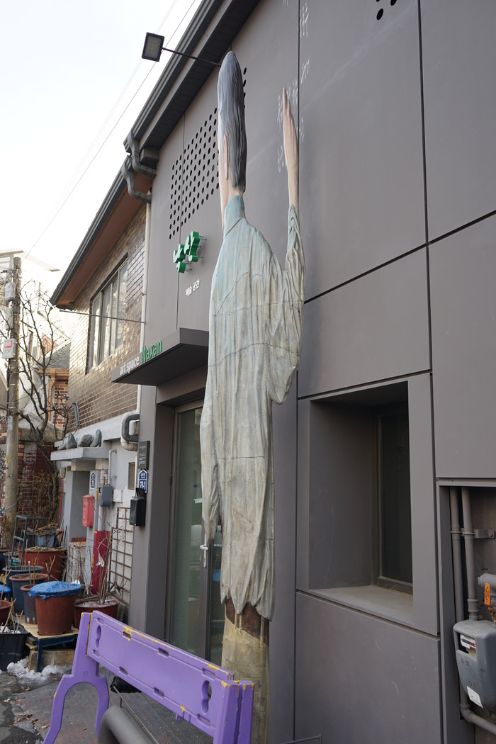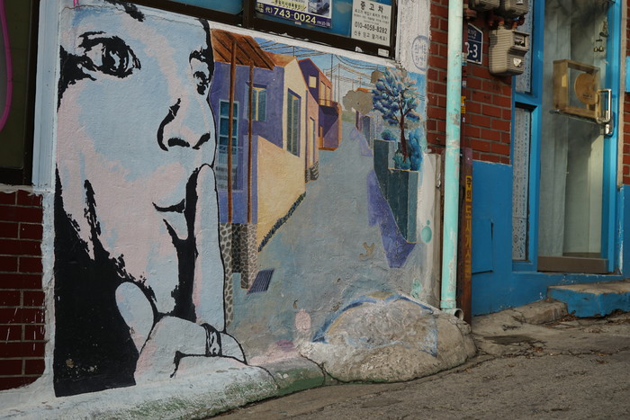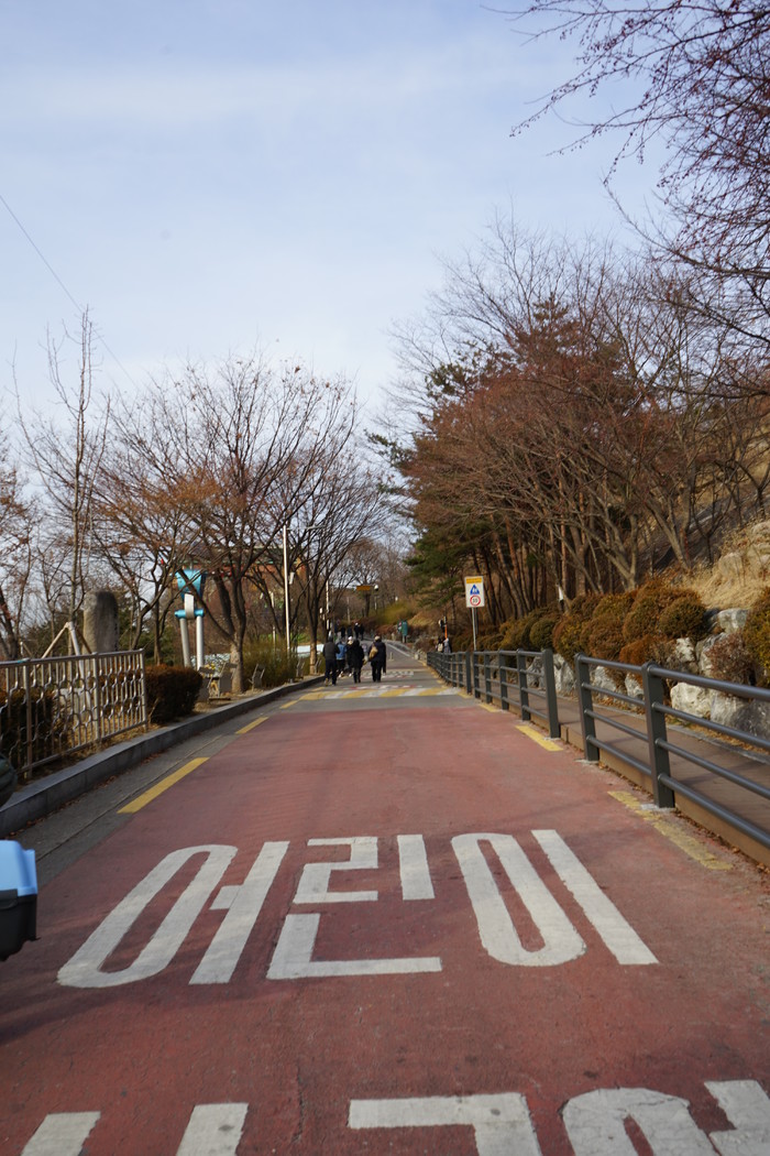 壁画村惠化站下车后,[2号出口出站后直行,在第一个路口有指示牌,沿着骆山公园方向走,到公园正门左转,沿路走大概15分钟就能看到了是斜坡来的,标志牌在上面,蛮高的,当时我们没留意到标志牌,就一直走,导航也是坑,带我们走到那个楼梯的地方也是景点之一]
