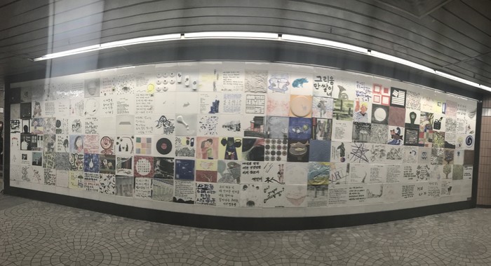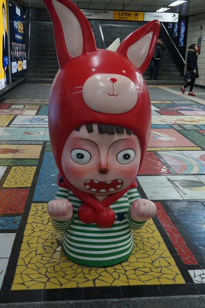 然后坐地铁去[弘大入口站8号出口],晚上真的满冷的,有些地铁站会有主题展品