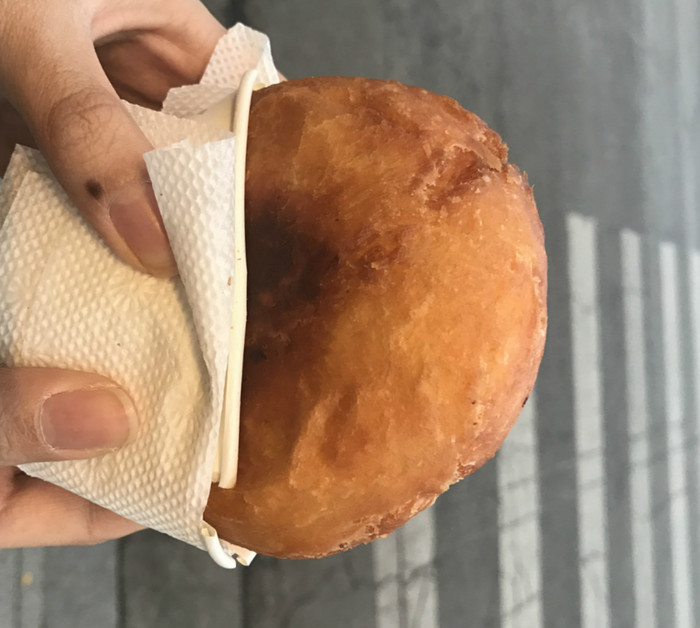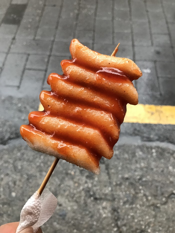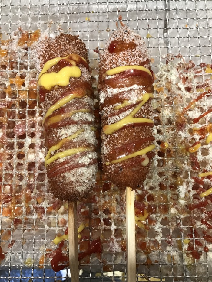 在弘大门口拍了照片就走了,赶去新沙吃年夜晚呢,在弘大附近看到有个店好多韩国人在排队,还是忍不住停下来排,炸面包里面是不同味道的香肠(人均9rmb),酱是自己加的,叫号用的是韩语,不过跟着排你前面那个人就可以了。味道还可以吧。[图片上我姐对面,黄牌的那边的马路(不用拐进黄牌那边)直走就是了,没多远。]