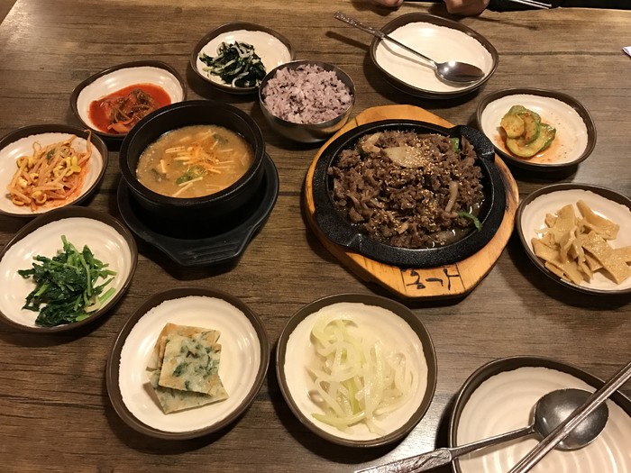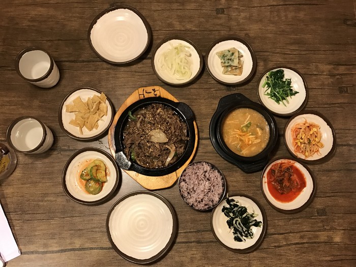 年夜晚当然吃传统的啊,去新沙吃杜小姐介绍的韩式传统套餐,依然很多港人呢,还有很多韩国人。只可以刷visa和现金。那天除夕满早关门的,好像9点就关门,拍完照我跟我姐狼吞虎咽,挺好吃的真的有种吃家里饭的感觉,点人传统韩餐1人份和粉丝牛肉泡菜汤。[出地铁跟着导航走就可以]