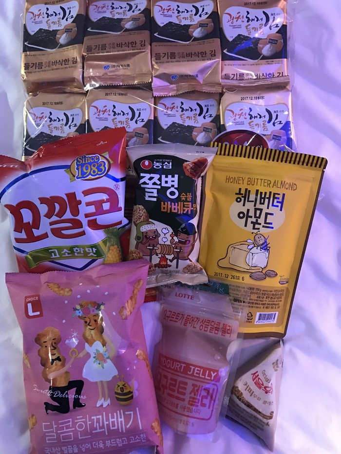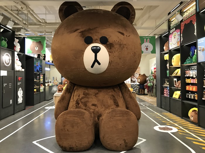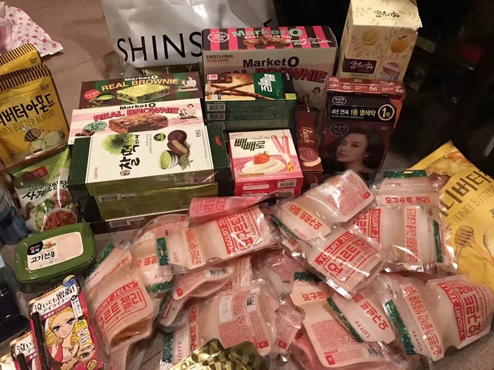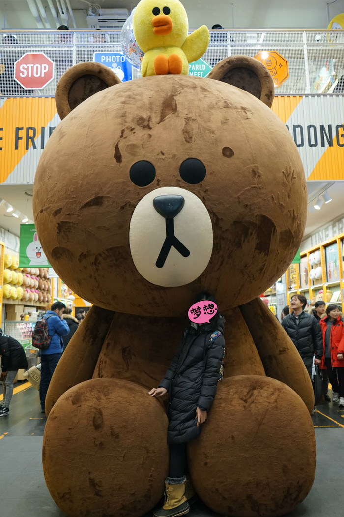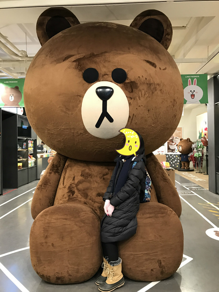 晚上回去明洞乐天免税店负一层乐天超市买了点零食试吃看哪个做手信比较好,敲黑板,如果你想买酸奶软糖做手信,推荐买7-11的版本,比较小比较便宜和好拿,非常适合做手信,还有草莓味的,当时犯傻买了乐天版的,很大一个,行李箱塞了很久,有一半都是吃的。在line拍了照片,明洞line的Brown是最大的,让你感受一下,比较小的是林荫道line