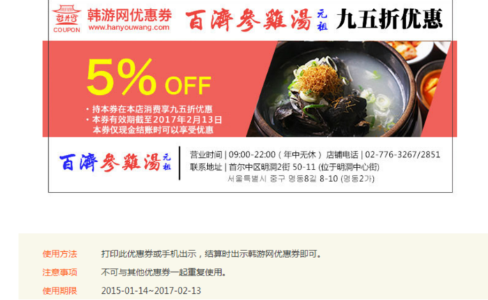 我姐不想早起和爬山,所以还是单独行动,不过已经摸清明洞的路了,去了朋友推荐的百济鸡汤(可以去韩游网找找优惠券,人均140mb),挺好吃的,会中文,人很多,小杯那个是人参酒,记得喝,不太能喝酒可以洒在汤里一齐喝,点比较贵的那个参鸡汤,好像区别就是有上面的人参丝。