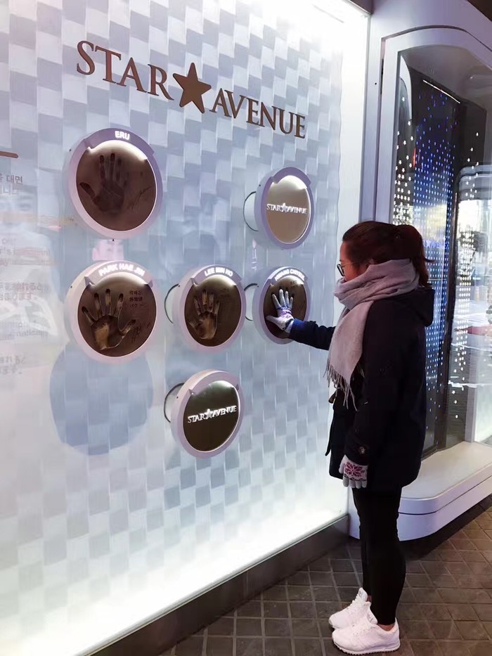 乐天门口前有条星光大道?里面很多明星手印,不追韩流不懂,我姐倒很激动地拍照。新世界的灯饰还满漂亮的。