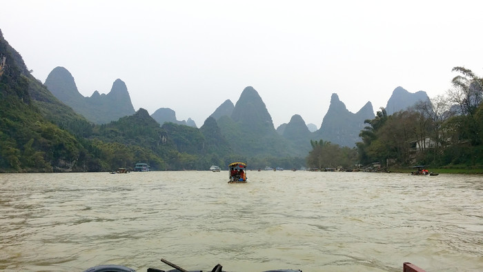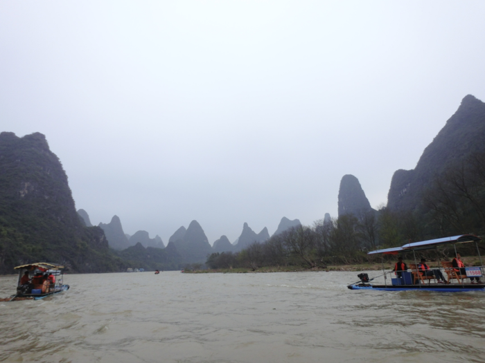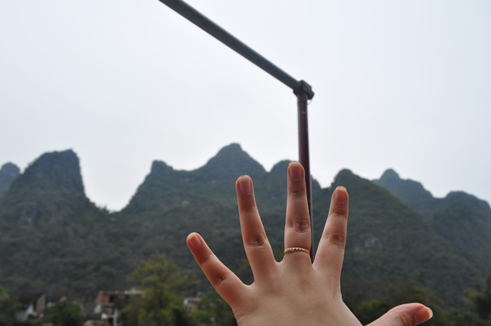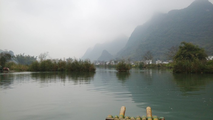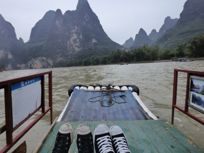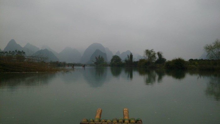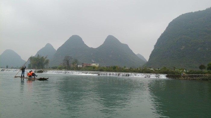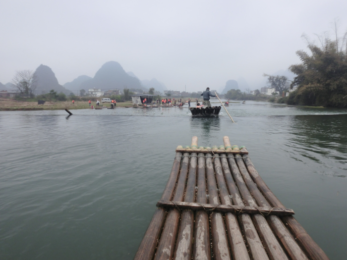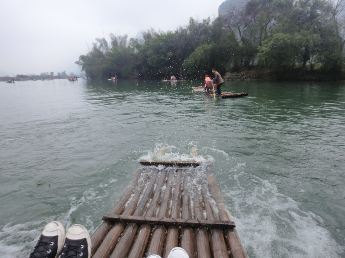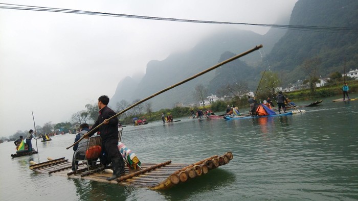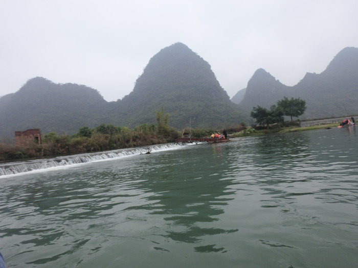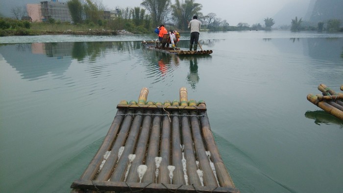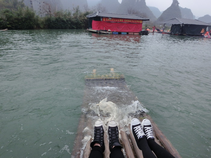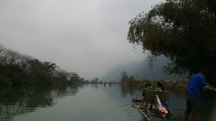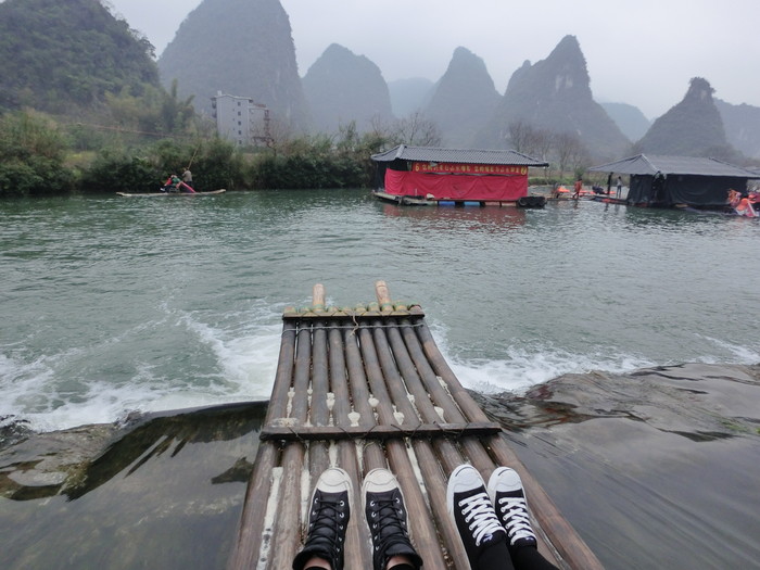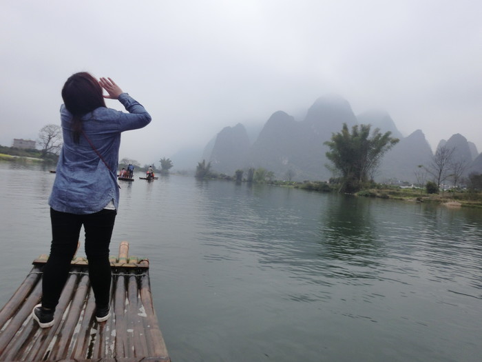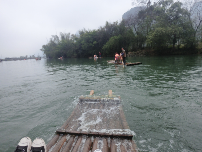 第二天一早买了点早餐就去乘桂林到遇龙河的车,下车点正好是遇龙河漂流附近,不是平时那种橡皮艇的漂流,是类似昨天游漓江那样,不过这是真正的竹排,是正真的人手竹竿撑船,一个竹排只能坐两个人,要穿救生球。游玩2个小时左右,没有漓江这么久。比漓江好玩多了,超级推荐,整个旅程最满意的景点。(帮撑船林师傅打个广告:13471396849)