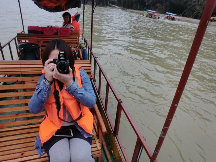 船是白色(或蓝色)塑料竹排上铺木板和固定的木椅,用发动桨划,要穿橙色的救生衣,船上有垃圾桶(最好自备垃圾袋),强烈建议带点吃和喝的上去,游玩时间挺久的,我和我姐中途都饿得不行。我们买的是单程的,到下游人民币20元背景图那里,往下走是兴坪古镇, 途中有很多农家菜,也有观光车送到古镇(要去买票),其实也不远,加上满多旅游团的大巴和人,路还是满堵的,所以直接徒步走下去兴坪古镇比排队坐观光车要快。