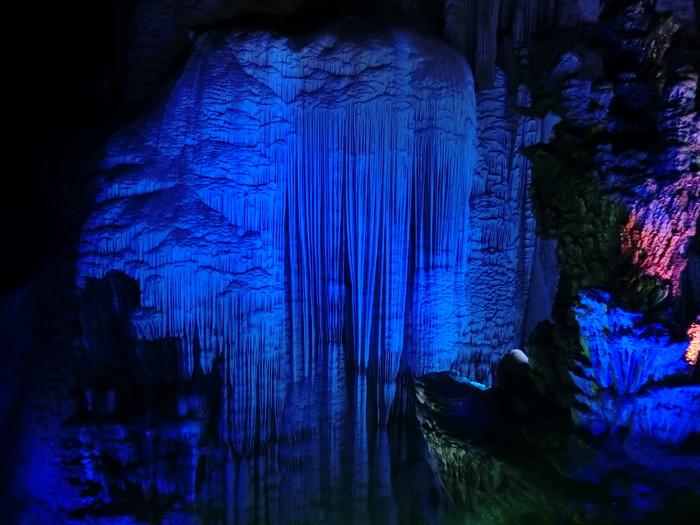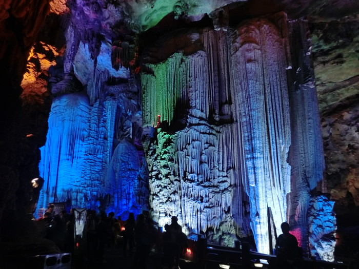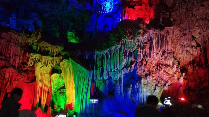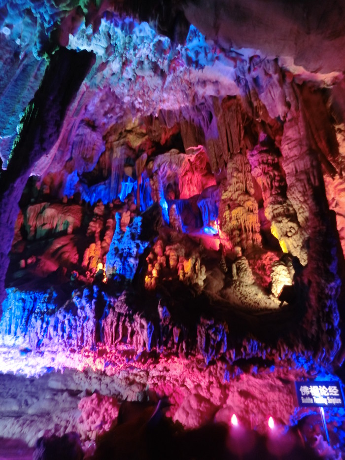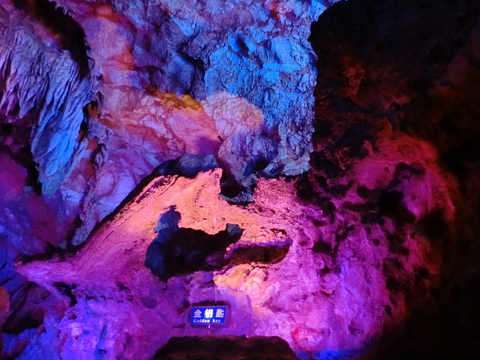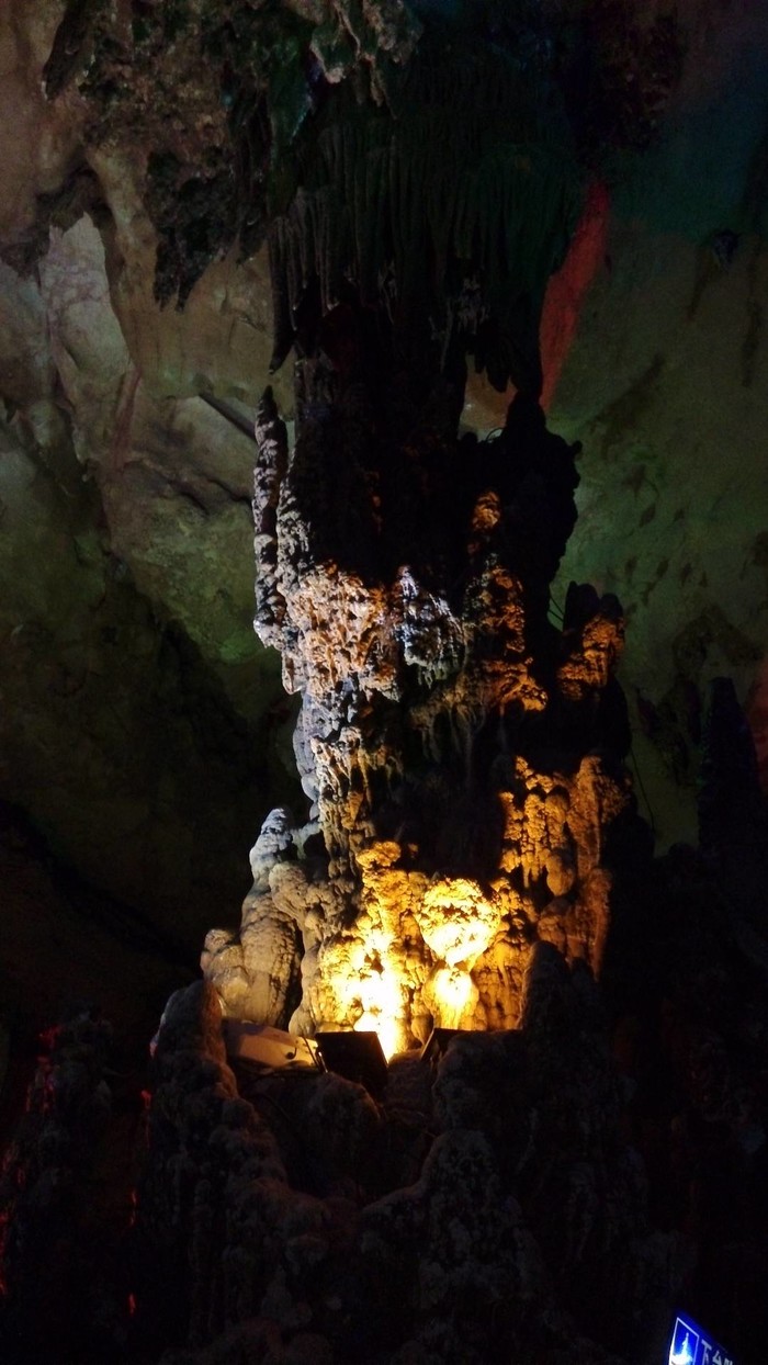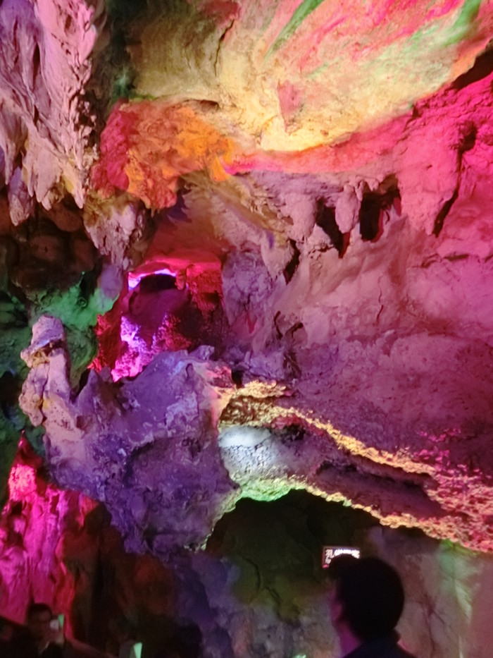 到了银子岩,司机是本地人应该有旅游证吧,帮我们买门票比正价要便宜。一批批进,有专门讲解员,我们没有跟着走,不过单人在里面走也怪恐怖的(看了《黑暗侵袭》最后快出岩那段路独自一人在走溶洞简直像鬼屋)。里面也就是一般溶洞+彩灯(照片比肉眼看漂亮),最后还有花给你献钱的,应该是骗人的。最特别是,整个溶洞路线是向上的,最后出口在山顶,下楼梯时有卖手信的。