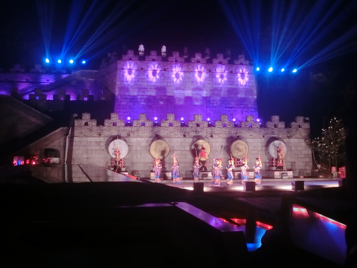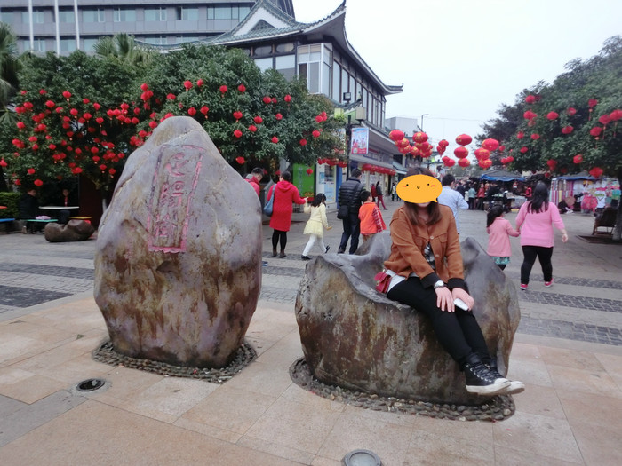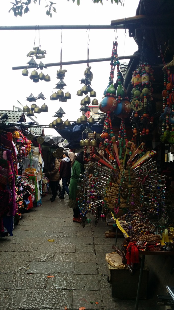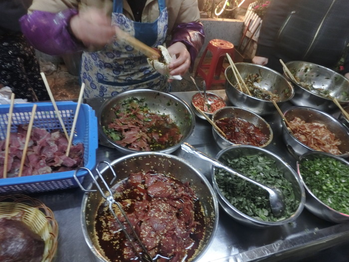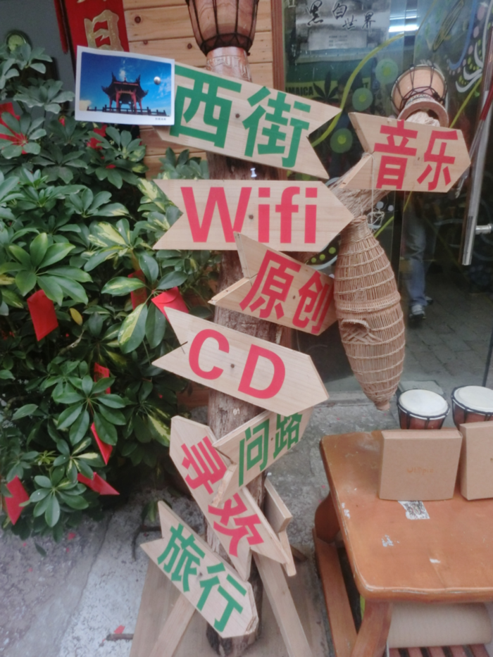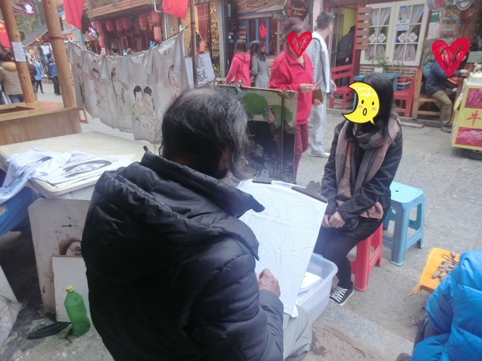 不听解说很快就看完,雇的车直接送我们到西街附近,看大众点评随便吃了一个桂林米粉,跟广州的没什么两样除了比较便宜。逛了一下西街,很多特色店,非常多人特别晚上,路口有台湾人卖台湾小吃,买了大肠包小肠和蚵仔煎,,味道还行。里面还有很多吃的,有好多外国人在煎香肠。我们还找了长得很艺术阿伯画人像T恤画(虽然回来家人都说不像)。