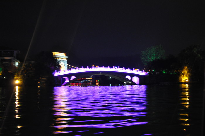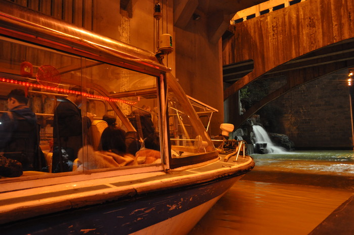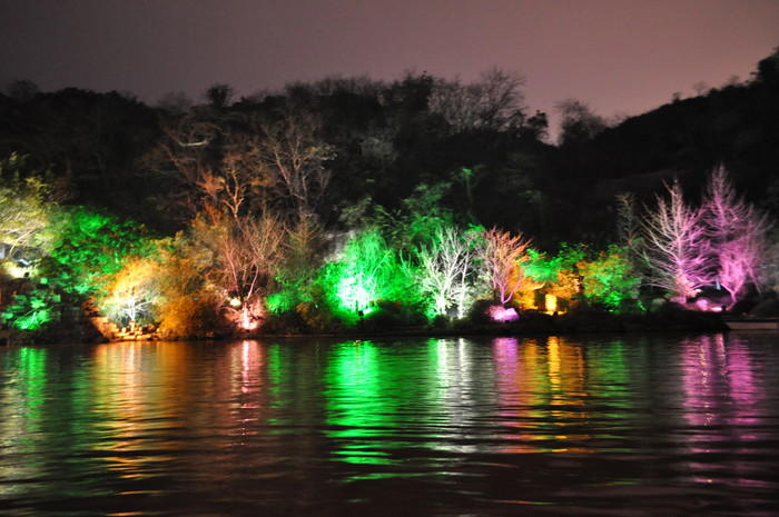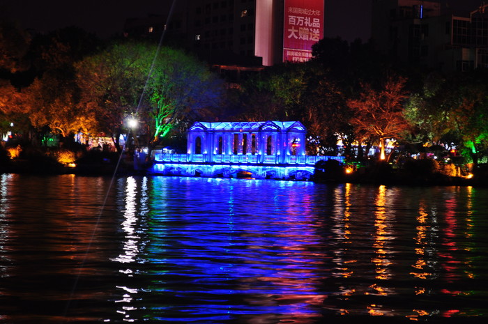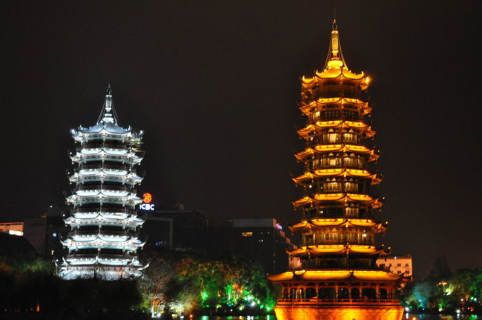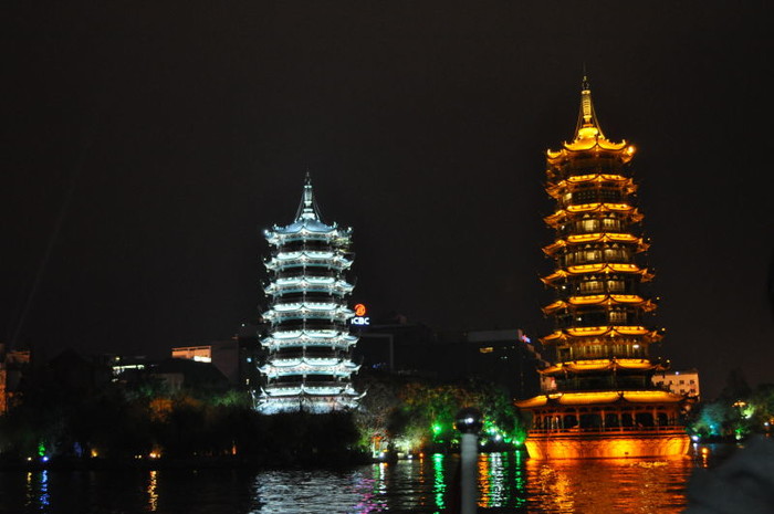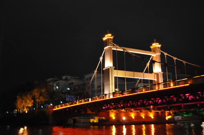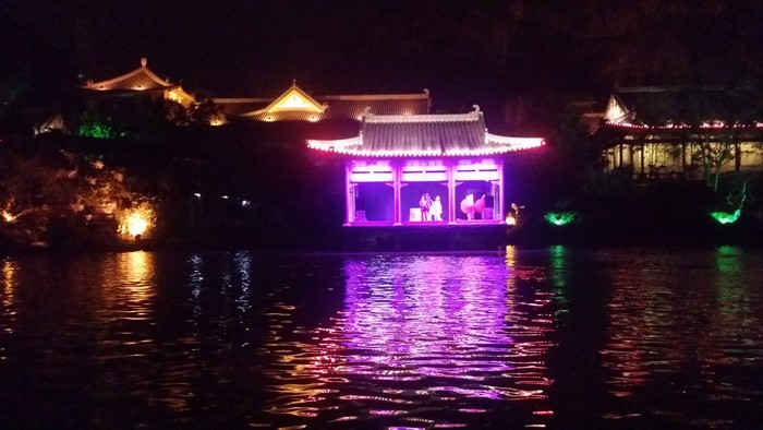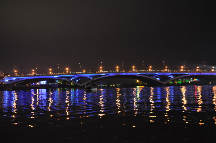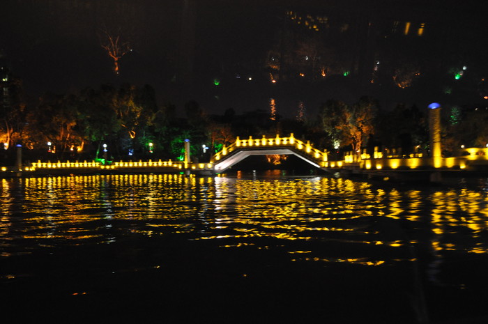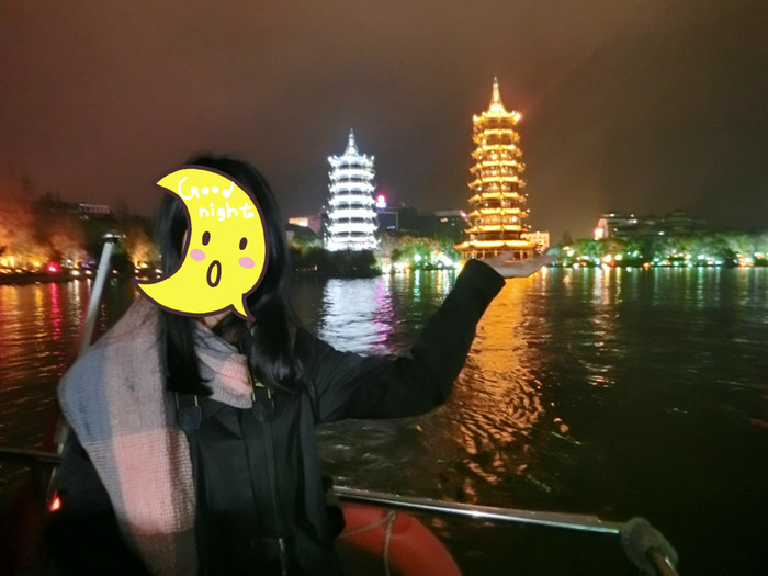等到傍晚就走过去两江四湖的集合地点(早点进去排队,印象不分座位的,占玻璃边上好拍照,集中的地方也是一个景点,白色的小塔),途中有一段水位高差需要经过河坝闸口换水位差,一次只能通两艘船,还有一小段刘三姐的歌舞,到金银塔可以按顺序走到船头拍照,会有摄影师帮你拍,会送你一张贴纸相大小的,大图需要给钱买,如果有同伴也可以自己拍。途中非常多特色的桥和桥底壁画,桥底两边有人行道自行车道,可以在附近租自行车游玩。