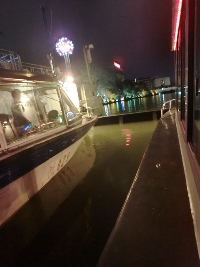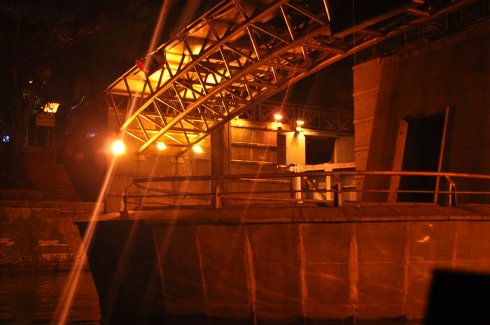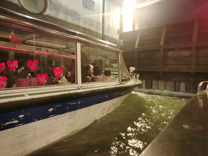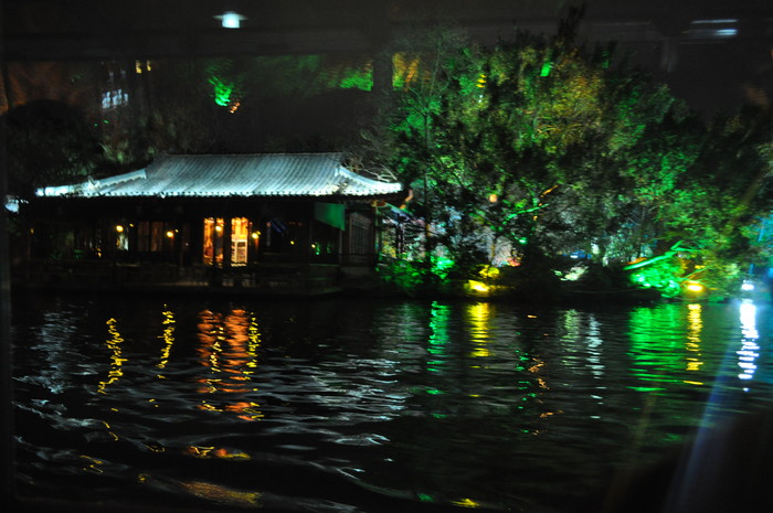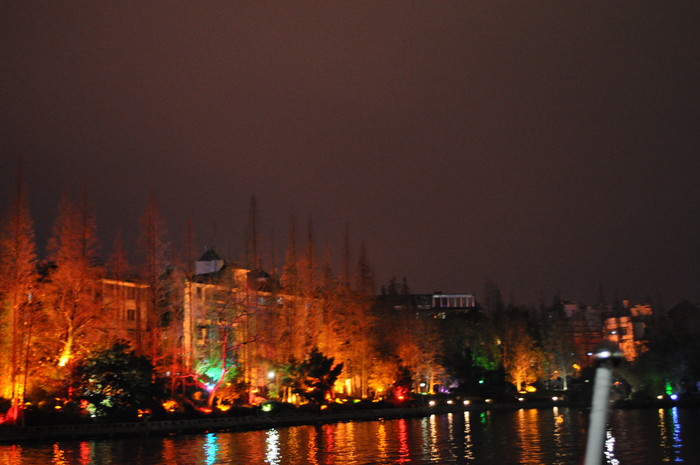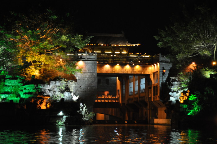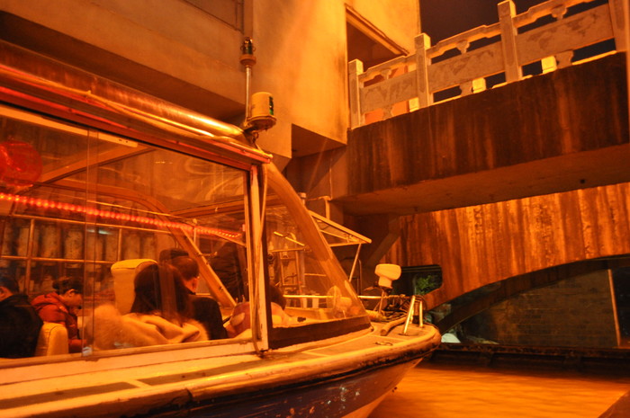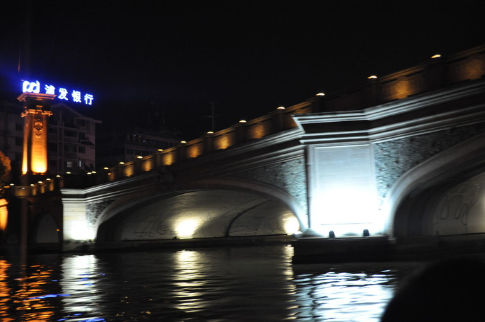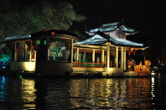 等到傍晚就走过去两江四湖的集合地点(早点进去排队,印象不分座位的,占玻璃边上好拍照,集中的地方也是一个景点,白色的小塔),途中有一段水位高差需要经过河坝闸口换水位差,一次只能通两艘船,还有一小段刘三姐的歌舞,到金银塔可以按顺序走到船头拍照,会有摄影师帮你拍,会送你一张贴纸相大小的,大图需要给钱买,如果有同伴也可以自己拍。途中非常多特色的桥和桥底壁画,桥底两边有人行道自行车道,可以在附近租自行车游玩。