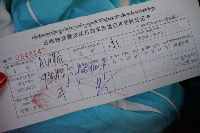 10.限速单,除了林芝现在开了高速公路(不确定现在是否不需要,当时跟他说高速公路来的是不用交限速单),像阿里要拿限速单,要盖章,如果开快了记得等够时间再去盖,每个点都要盖(就是要按指纹的地方都有得盖,有司机通道的),不然到最后是不会给你过的,我们有一次真的忘记盖了,忘记哪个点,负责去交涉对交警态度比较好,交警也就罚我们在一旁等够时间而已。那时也有一队人忘了盖,态度非常不好,他们一气之下开回头了,我们可以走的时候他们还没有回来。