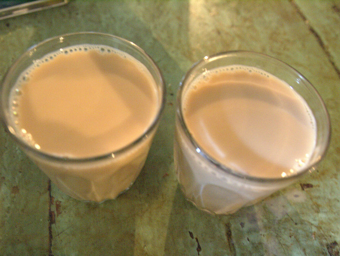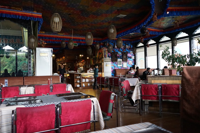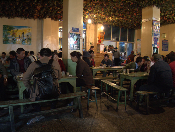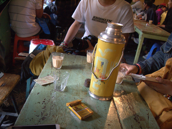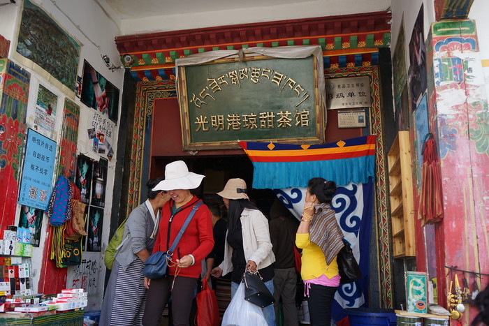 然后去光明港琼甜茶馆喝甜茶,其实就是甜的奶茶,这比酥油茶合我们胃口多了。进甜茶馆自己拿杯子,里面边上排着很多干净的玻璃杯,你可以按杯买,也可买一壶,杯的话找位置放空杯和钱,有服务员提着壶过来倒,买一壶的话好像在拿杯子附近直接买一壶,喝完还给他们就行了。