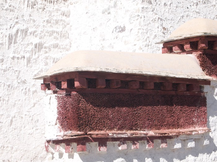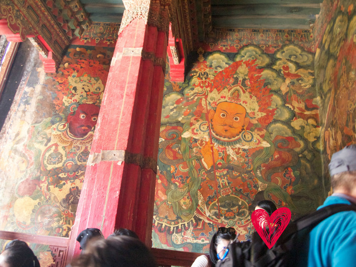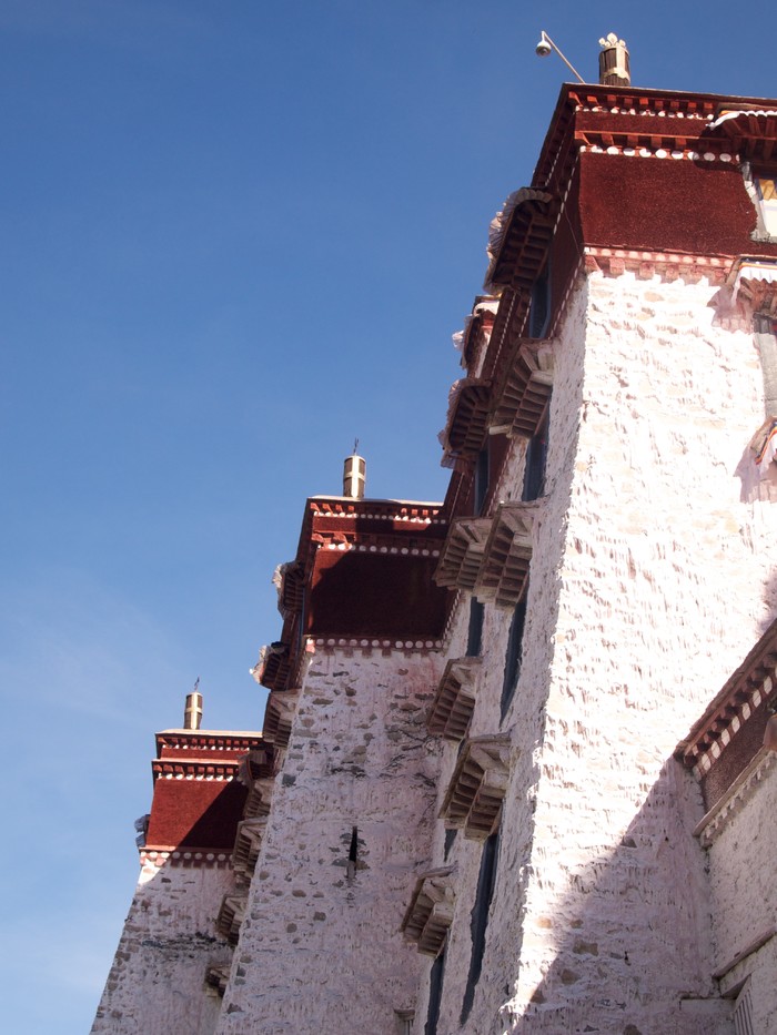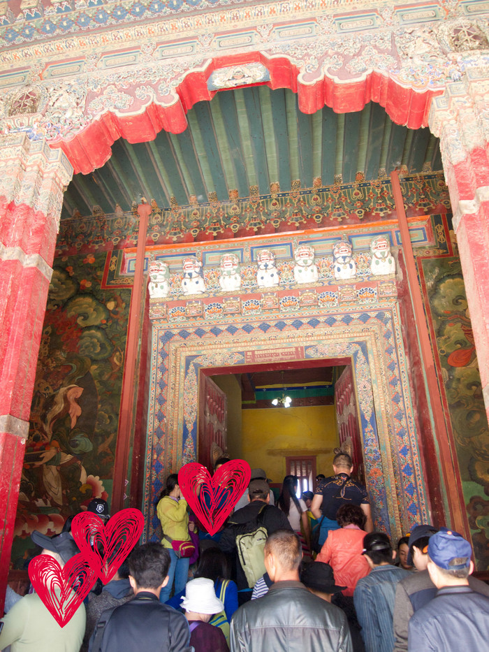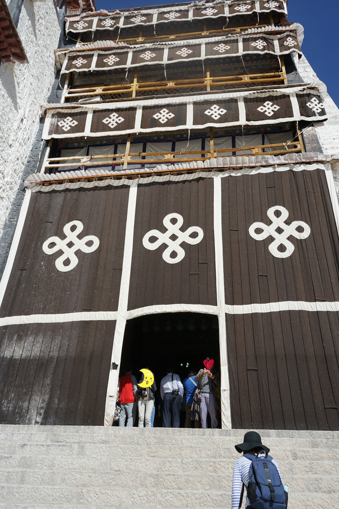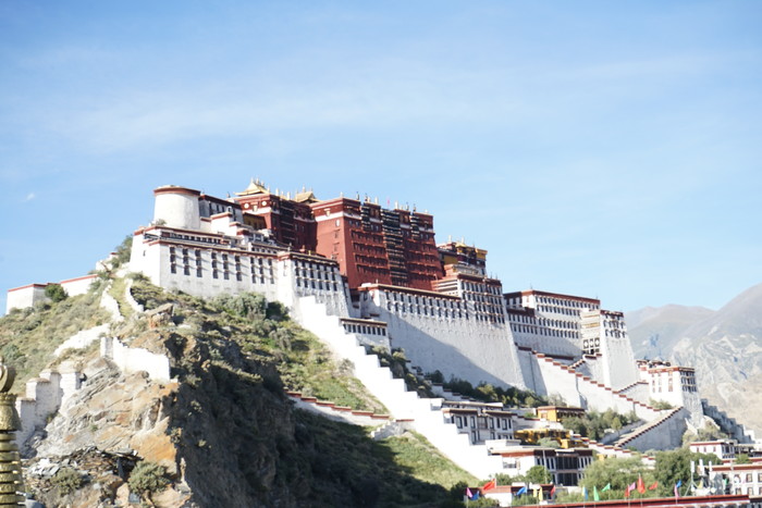 然后汇合表表哥他们出发去布达拉宫,我们是报当地的团,有导游解说,墙上红色的地方都是用珊瑚建的,布达拉宫没有缆车必须要自行爬楼梯上(真的挺累,最好带多点水,要爬一段路才有水卖 ,爬的过程也可以看看拉萨市),穿过黑色布的门有个小广场,广场是售票的地方,检票进门里面是不能拍照,印象中里面是佛像寺庙。