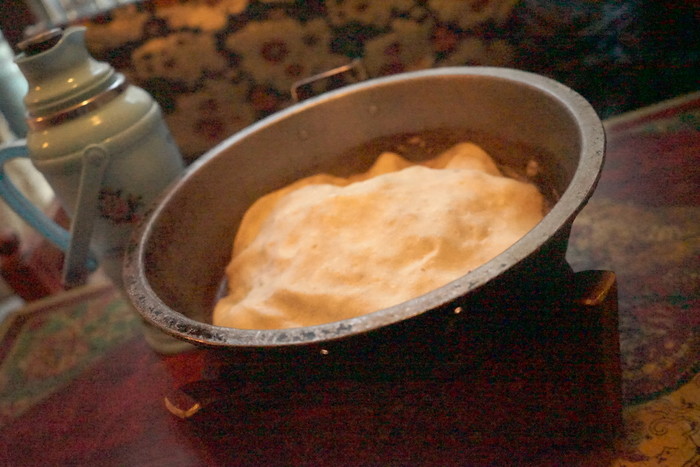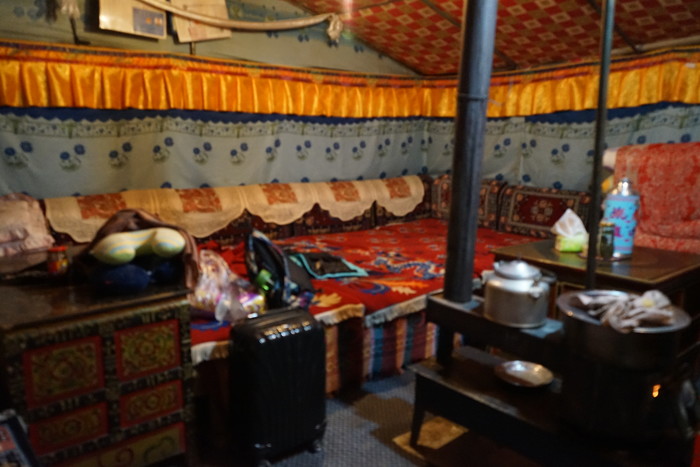 帐篷中间有个暖炉可以煮饭和供暖,然后悲催的事就发生了,因为包了一个帐篷,帐篷的主人去别的帐篷睡,当我们睡到一半的时候暖炉居然烧!完!了!(而且因为这里树木比较少,所以燃料一般都用干的羊粪或者牛粪,所以有一些民宿会有一股很大的膻味)然后我们都冻醒了,个个都有点高反和睡蒙了,表表哥他们就有样学样地把羊粪放进去,看着点不着,还把干洗洗手液(含酒精)也加点进去,还是烧不起,当一个东西不能充分燃烧的时候只会一股劲的冒烟,然后本来空气就已经很稀薄的帐篷里一直在冒着带着膻味的青烟,而且还不暖,羊粪还跟我们抢氧气燃烧,我们考虑5秒就放弃了,开着门通风,在寒风中裹好自己勉强睡去。然而我看到水哥真系非常奇怪地把头对着通着寒风的门睡,第二天就整个嘴都肿了还呈暗紫色(严重高反,我当时也没有力气说他,大家不要学)。