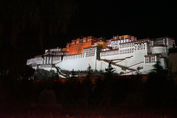 晚上去了附近感觉非常地道的餐馆吃了藏餐(应该是土豆羊排,上面有一层面粉皮),不过我和我姐都吃饱了,吃了几口就没有吃,基本就表表哥吃,在附近找到一个粤菜馆打包一碗粥给水哥(不得不说拉萨的粥真的好贵,小小的一碗40rmb)。顺便拍了布达拉宫的正面夜景。