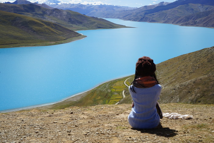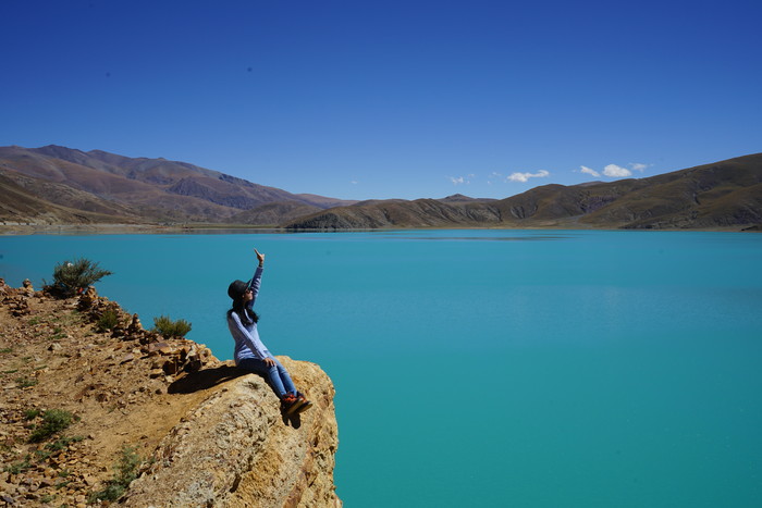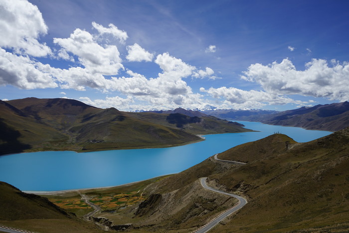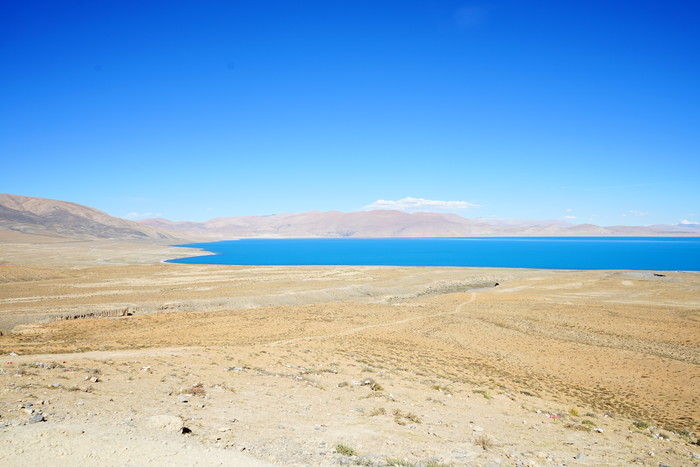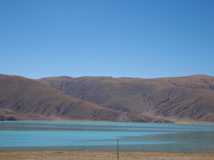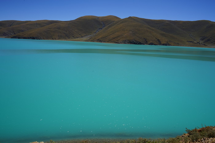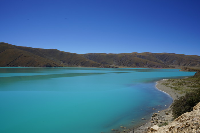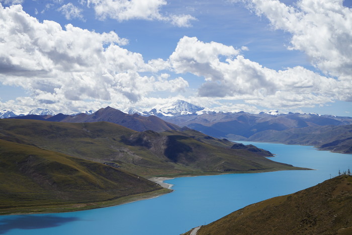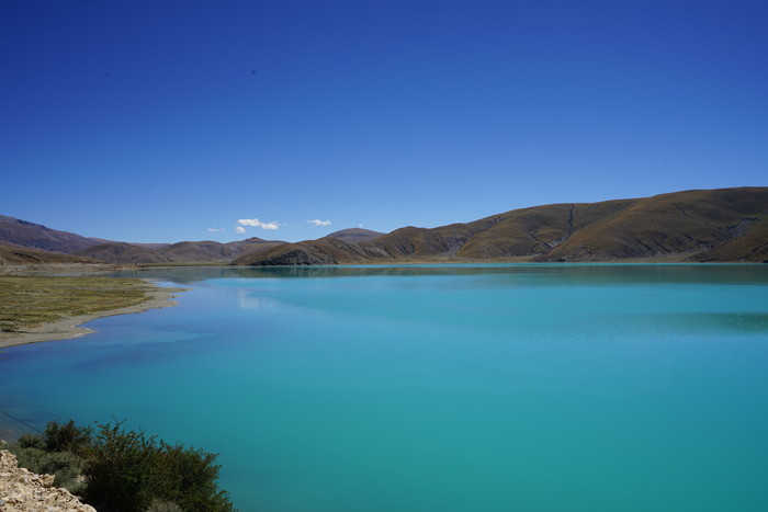 全程最漂亮的地方,三大圣湖最漂亮的就是羊卓雍措!也有可能是因为三个圣湖之中唯一一个能在观景台看到全湖的缘故。湖水真的超级漂亮,是以天空蓝为主色调的蓝绿蓝绿,远望平滑如镜,细看金波粼粼,照片完全拍不出那种美!请务必亲自去看看!美到一种极致需要借助脏话才能抒发内心的赞叹!!美到我们都想去摸摸湖水, 别看这里好像离湖很近,其实非常远,我们开了一阵子发现不对劲就放弃往回走了。