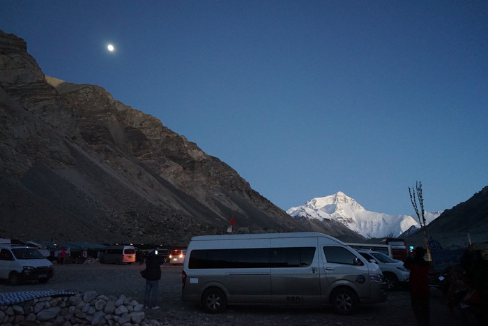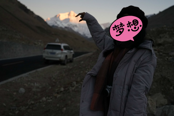 过珠穆朗玛峰国家公园后山路会变得非常蜿蜒,来到石碑前已经下午6点半到珠峰大本营都快8点多了,在快到大本营的时候看到非常多人停车拍照,我们也跟风停下来和雪山合照。到晚上能看到非常多星星,其实之前一路上都能看,但这里真的好多,其实到后面阿里看到的会更加震撼。