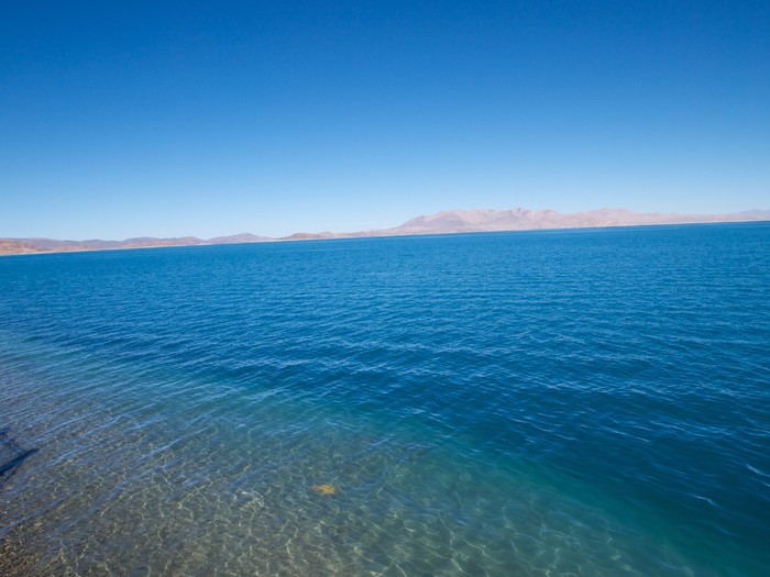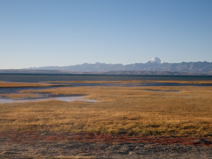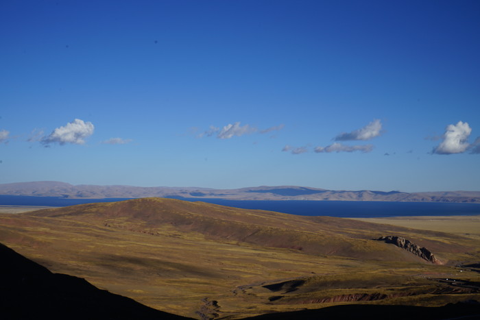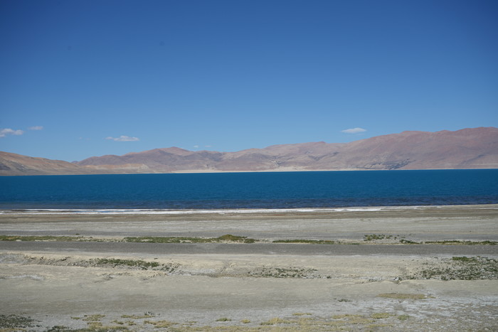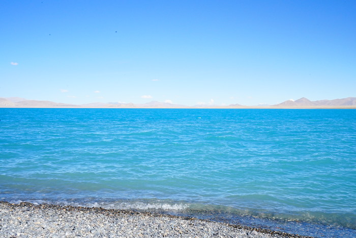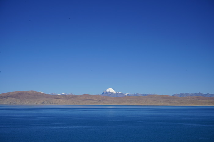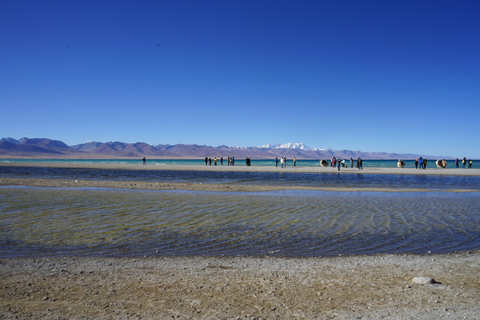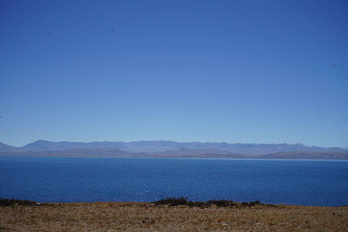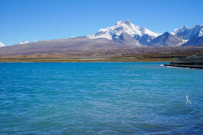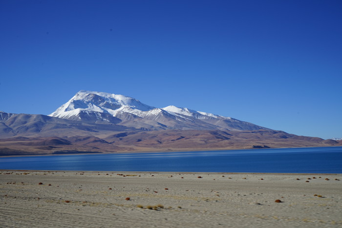 虽然说赶路不过我们还是顺道来看鬼湖---拉昂措,司机说想试试鬼湖和圣湖的水。圣湖和鬼湖与神山对望,鬼湖和圣湖就在公路左右两侧。鬼湖的水也和漂亮,就是没圣湖那边有风有浪,平静如镜。
