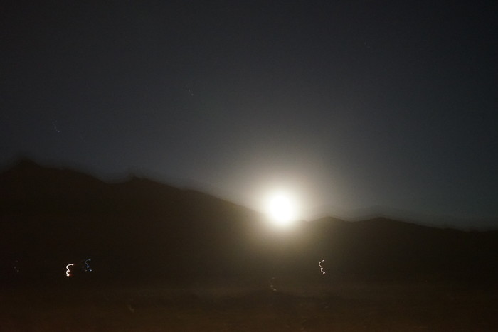 经过鬼湖和圣湖的标示牌后,我们来到这附近的最高点,比周围的山还要高,在这里看星星真的美到我整个人都呆住了,四周都是星星像众星拱月一样围绕着你,你平行视线处都是星星,而且确实能感觉地球是圆的,因为星星是呈半球状地包围着你,恍如站在世界的中心。(下图黑暗处的那张图确实是月亮,像太阳般亮的月亮)