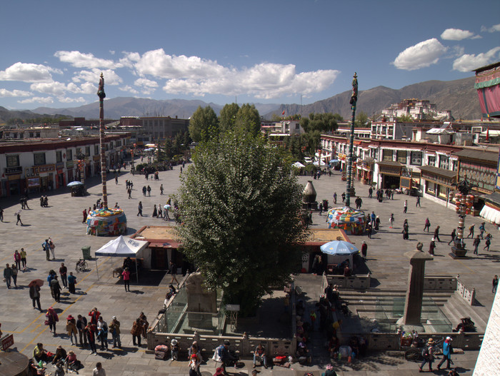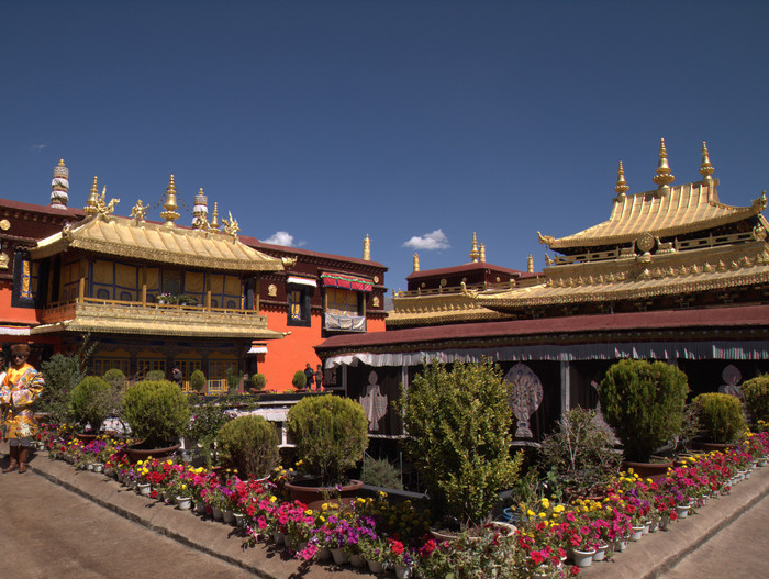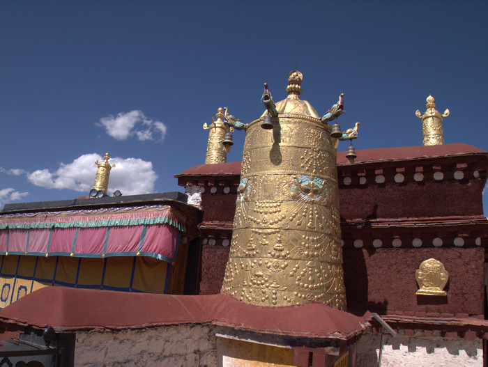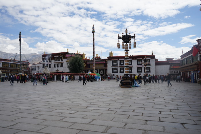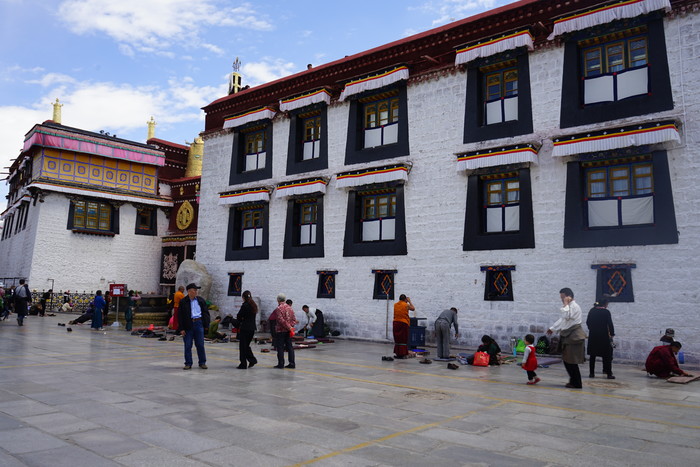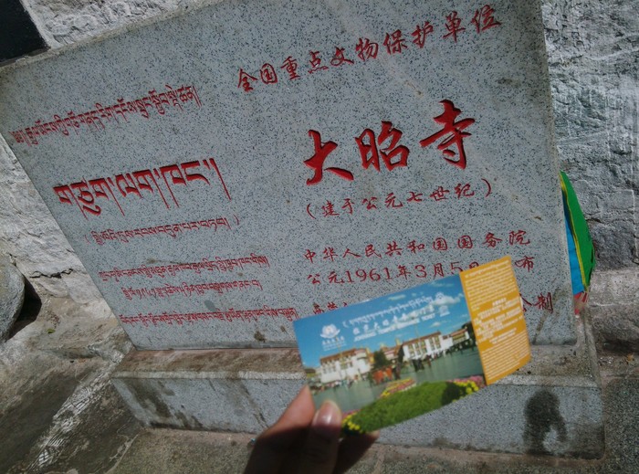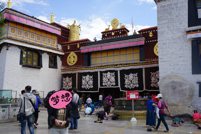 大昭寺的门口和它身后的八角街都非常多信徒在跪拜,而大昭寺里面和八角街都有经筒。 进大昭寺广场要安检, 大昭寺售票处也非常多站着导游或者讲解员,不过我就直接买票进内,同样的寺庙内不能拍照。