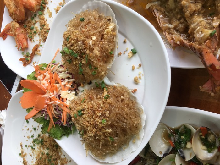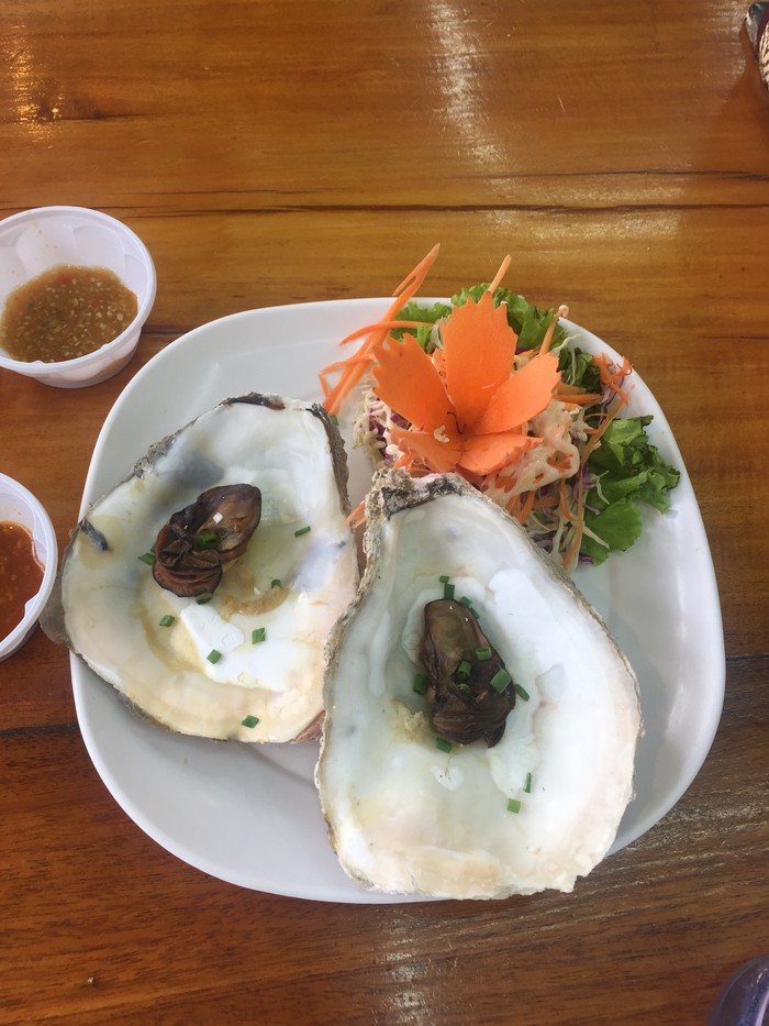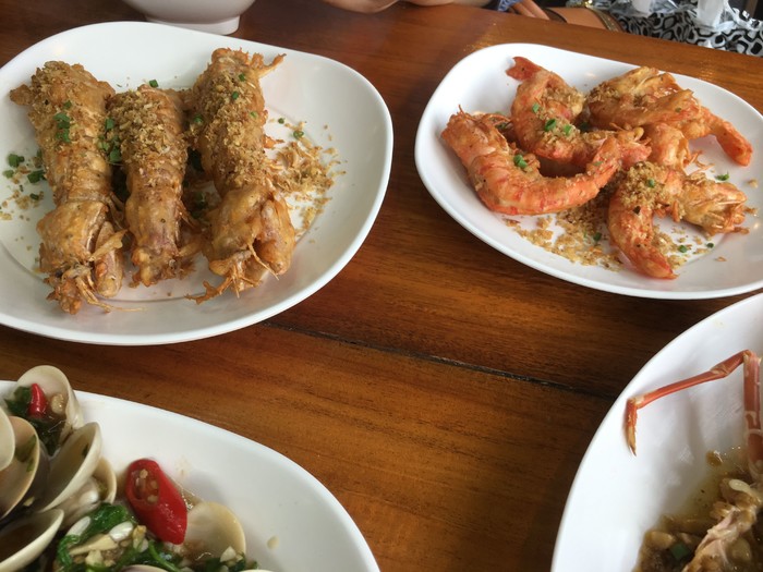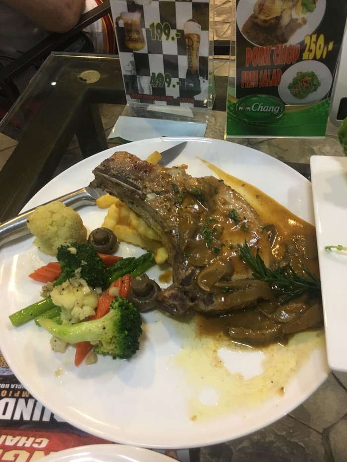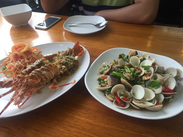 额......点了猪排、虾,沙拉是送的,米饭是我要吃的,谁让海鲜什么的都是浮云呢,完全不顶饿啊。这一餐吃了550泰铢,量很足,很好吃!