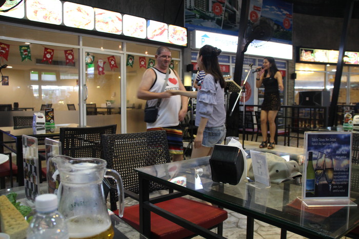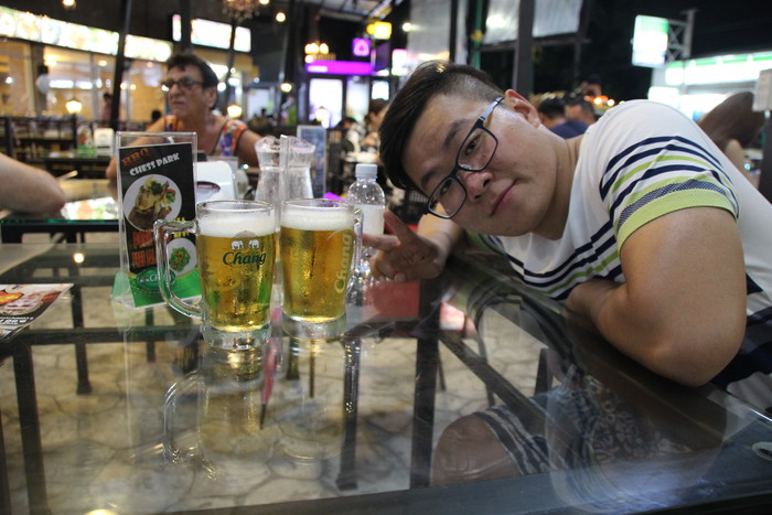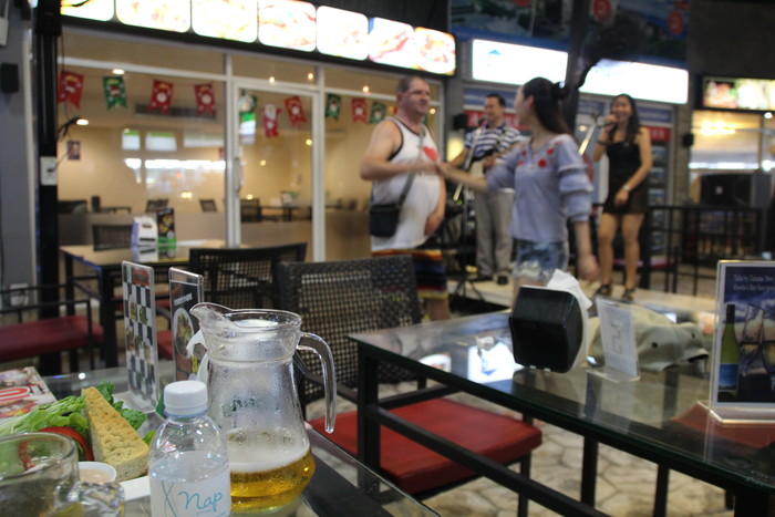 因为坑爹的海鲜压根没有吃饱,我跟昊哥又出去觅食啦,夜晚的芭东热闹非凡,到处都是大排档酒吧,我们就在酒店对面一家露天餐吧坐下,因为这里有个驻唱歌手,唱 了一首好听的甜蜜蜜~~·昊哥还骚气的点了一扎鲜啤。