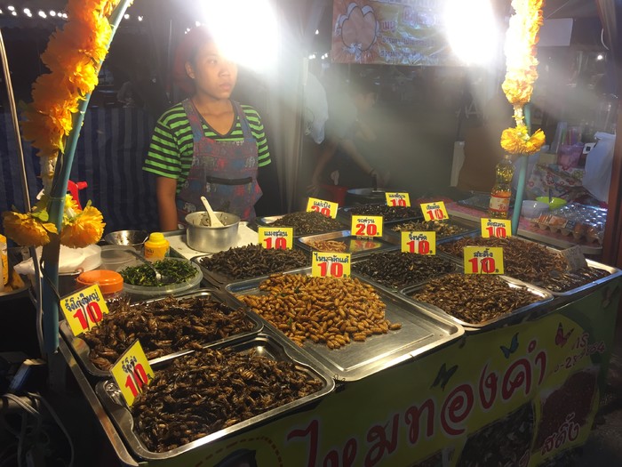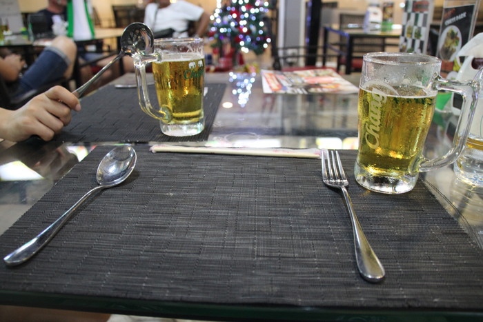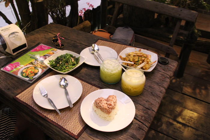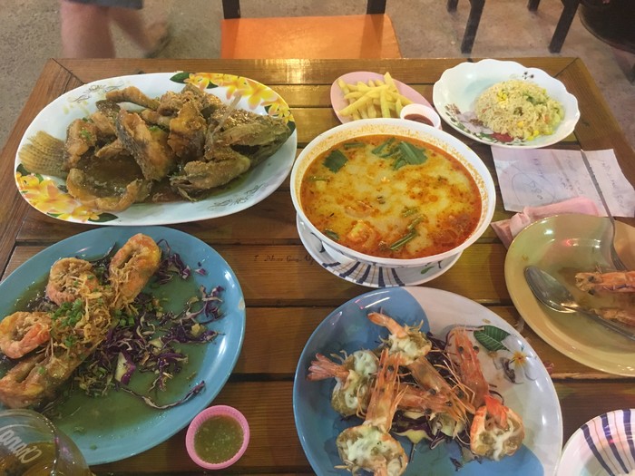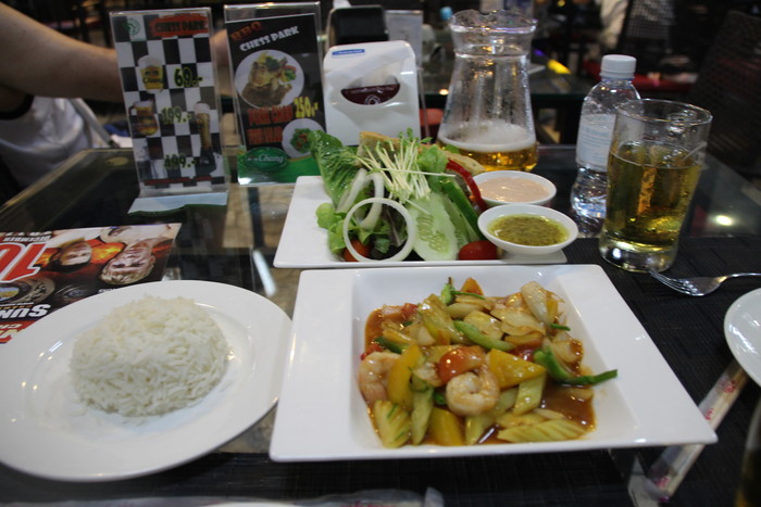 我们点了一份菠萝炒饭(难吃),一份炒牛肉末(超咸),一份炸炸的小螃蟹(很一般),一份空心菜(好吃),一瓶啤酒,一杯橙汁,总共700多泰铢。反正我是不推荐你们去尝试的!!!