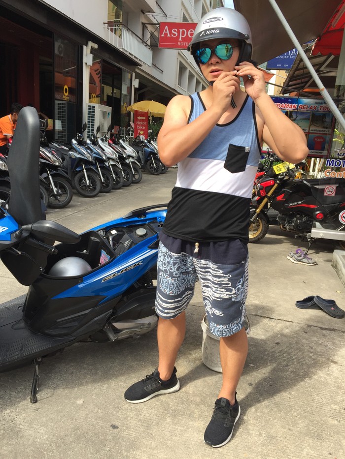 这里说一下,昊哥没有开过摩托车,只在国内开过电瓶车,那里的摩托很好上手,有了摩托方便很 多,我们这次旅行吃美食看风景,全靠它。但是,开摩托车千万千万要注意安全,一定要戴好头盔,控制好速度,普吉的公路都是山路,有很大的斜坡,而且靠左行驶,跟我们的习惯都不一样,昊哥就不小心別到了手腕,现在还贴着膏药呢。所以,如果没有把握,不建议租摩托,如果要租,一定要谨慎驾驶,安全第一。