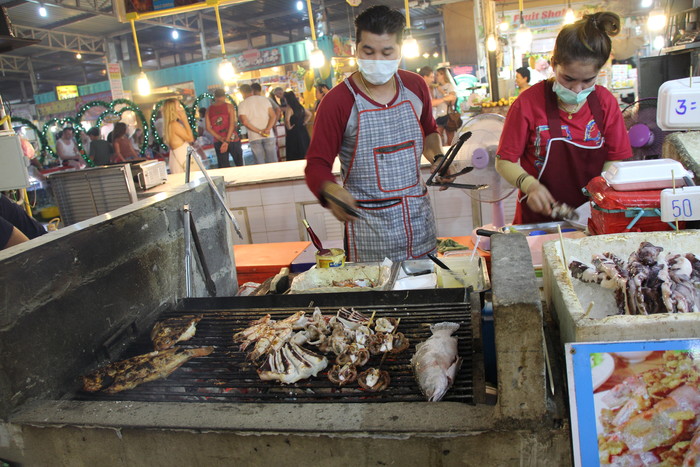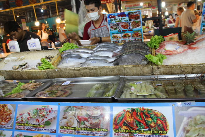 我就有种不祥的预感,结果在一家中文说的很溜的老板那买了一只大龙虾,6只斑节虾,3只皮皮虾,2个扇贝,2个生蚝,老板拿计算机告诉我2200泰铢,我说太贵了,他说可以砍价可以砍价,你说多少,我说1200泰铢,他转头就走,我看他不乐意我们也走了,他嘴里还嘀咕着什么"你不要去转了,买不到的比拉比拉什么的",就在我们走了5米,他又回来喊我们,说1300泰铢,加点花甲,卖给我们了,我们赶时间,也不想转了,就成交了。临走时,他还说我会还价(我当时心里想,我要是会还价你就不会卖给我了),然后问了说二楼加工,加工费100-150泰铢。