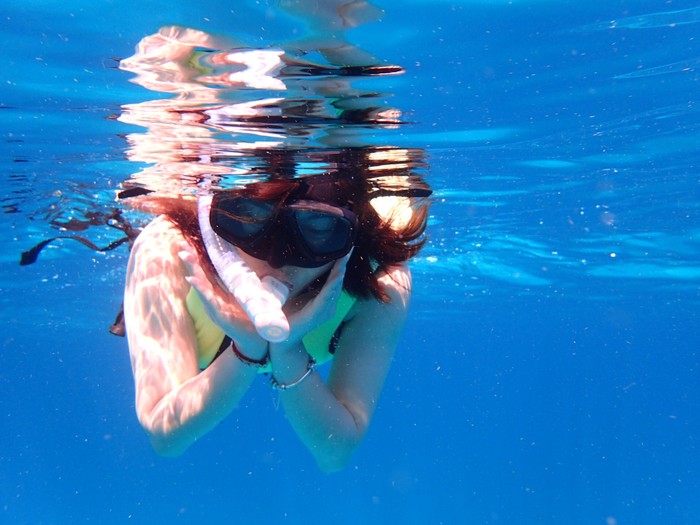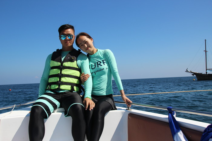 浮潜工具:我们自己在淘宝买的浮潜面镜+呼吸管(其实船上都给发一次性的咬嘴),浮潜服,浮潜袜(必备),手机防水袋(必备)我跟昊哥都不会游泳, 第一次下海,心里比较忐忑,所以准备的比较多。
