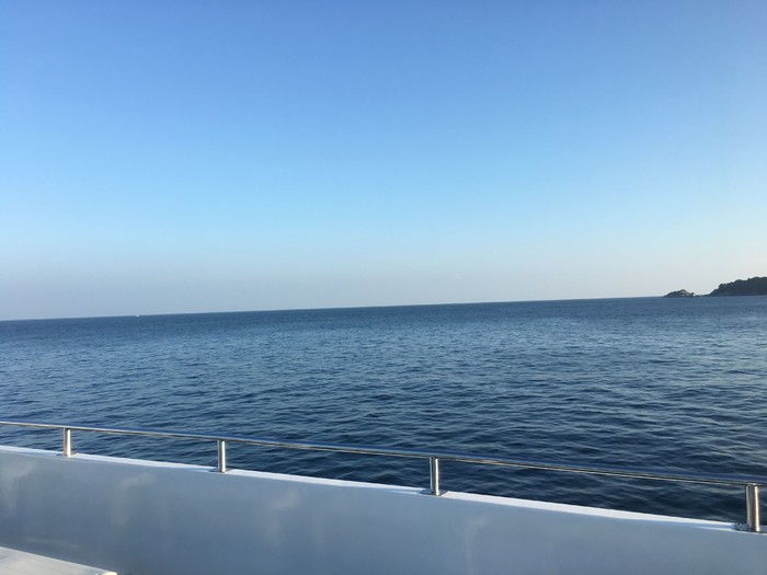 出发前,把拖鞋都寄放在码头,排队上快艇,我跟昊哥坐在了第一排,怕晕船,提前吃了晕船药。事实上这快艇比我想象的好,除了声音躁了些,其他都还好,一个多小时的船程,我丝毫没有晕船的感觉,昊哥更是睡的迷迷糊糊,同船三四十个人,只有一个女孩子吐了。