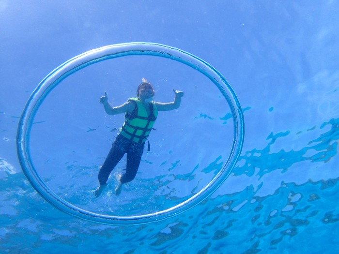 到了浮潜点后,已经有好几艘快艇在那浮潜了,一眼望去全是人啊,就跟赶鸭子一样,全部噗通噗通下水,叽叽喳喳,不会游泳的有个救生圈,三四十个游客,就那么几个船员,实在是顾不来,昊哥下水了,我看着害怕,一直让前面的人先下,躲到最后,然后鼓起勇气下水了,扶着救生圈,整个人往后仰了,脸朝天,不行不行,我要上去,然后那个船员就送我上船了,我就决定,我再也不去浮潜了,我就在船上看看风景,拍拍照。