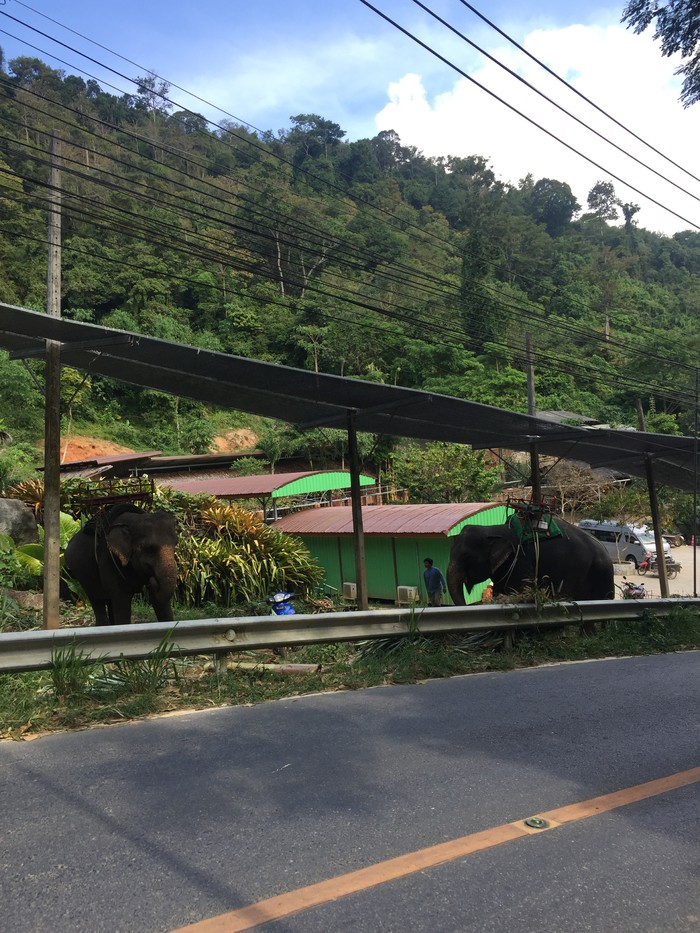 摩托车沿着公路转到山路,一直认为普吉都是海景,环山而行,才发现普吉的山景也别有一番风味,没有海边的酷暑暴晒,山里多了一份宁静,空气清晰,满眼绿色,让人神清气爽。路边偶遇大象,忍不住停下拍了个照片。