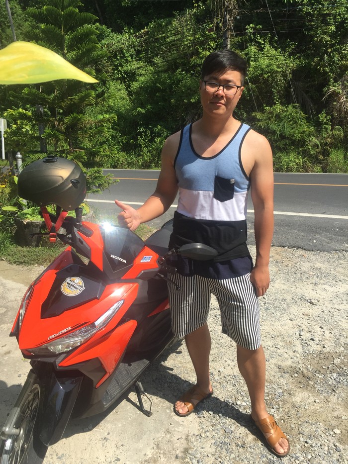 鉴于昨天走路累死的教训,今天吃完早饭后,我们毅然决然在酒店边上租了辆摩托车,250泰铢一天,押了一本护照,老板娘很好,虽然不会中文,看我们不大会,就手把手教我们怎么启动,熄火,上锁。昊哥司机,我导航,普吉很多是单行道,一开始还开反了,老板娘连连把我们喊回来,额,大写的尴尬啊 ̄□ ̄||