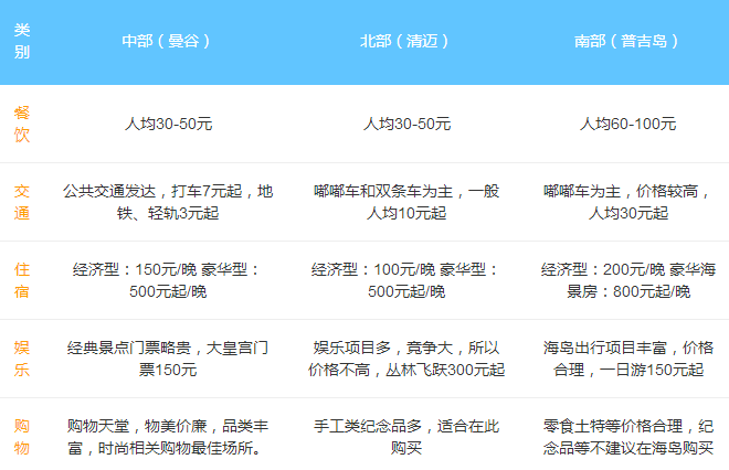 (表格举例说明泰国消费水平,以曼谷、清迈和普吉岛3个热门旅游城市为例(仅供参考))