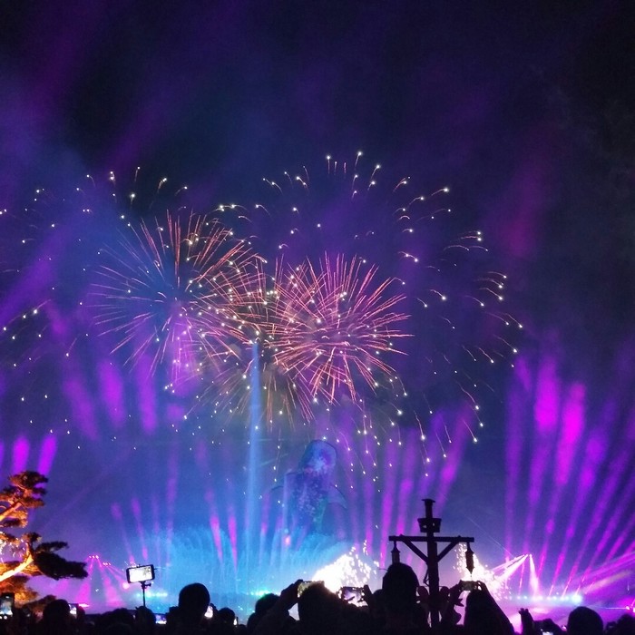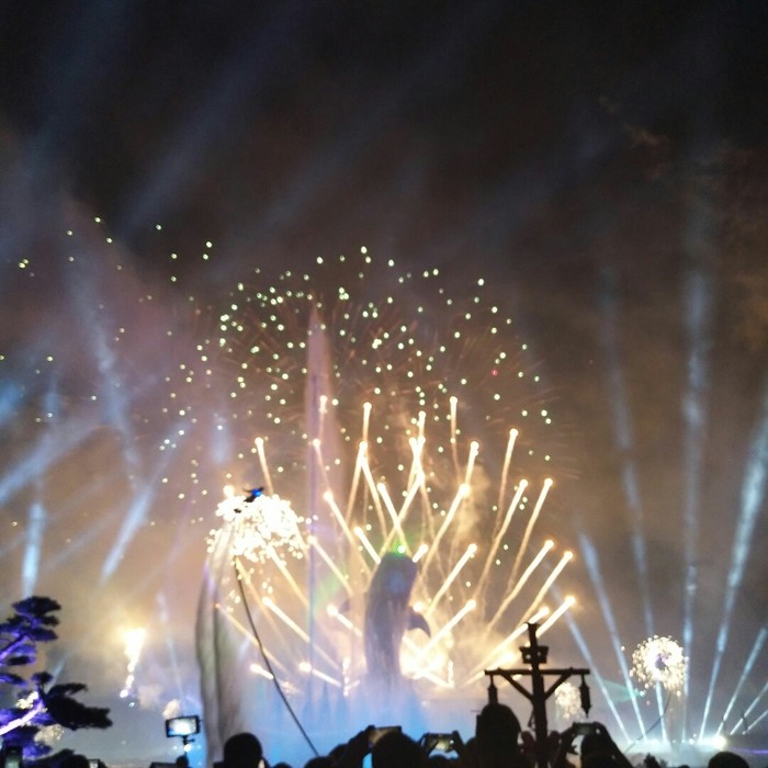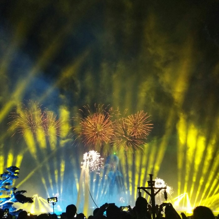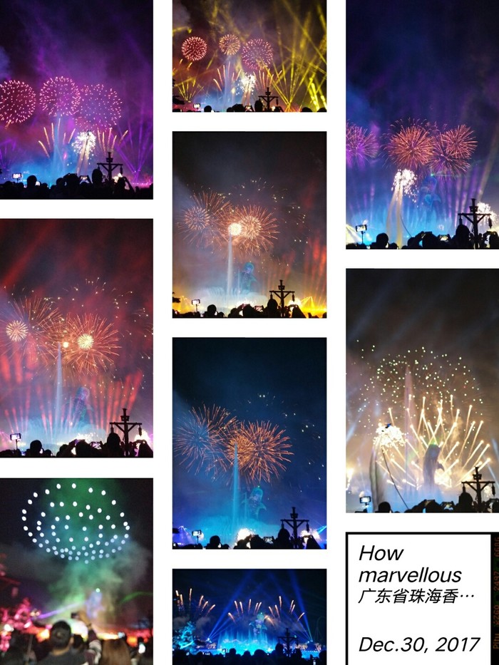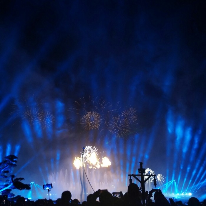人工湖还有几个人在表演那个水柱升天,因为在夜晚,然后能看到表演者穿的服装荧光色条,但他缓缓飞起来的时候,给我感觉就像蜘蛛侠和钢铁侠,造型差不多,身上还带着烟花,整体比白天表演来的震撼点~