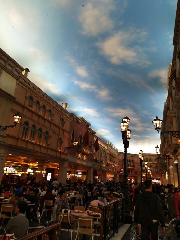 我们来到威尼斯那个有名的天空,看到是看到了,天空是不错,天空下的人群让我想到了广州的天河城,一样的人多,围着天空一圈都是各种吃食,然后中间是共享的座椅,选择你要吃的,排队买好了自己找位置坐就好了。