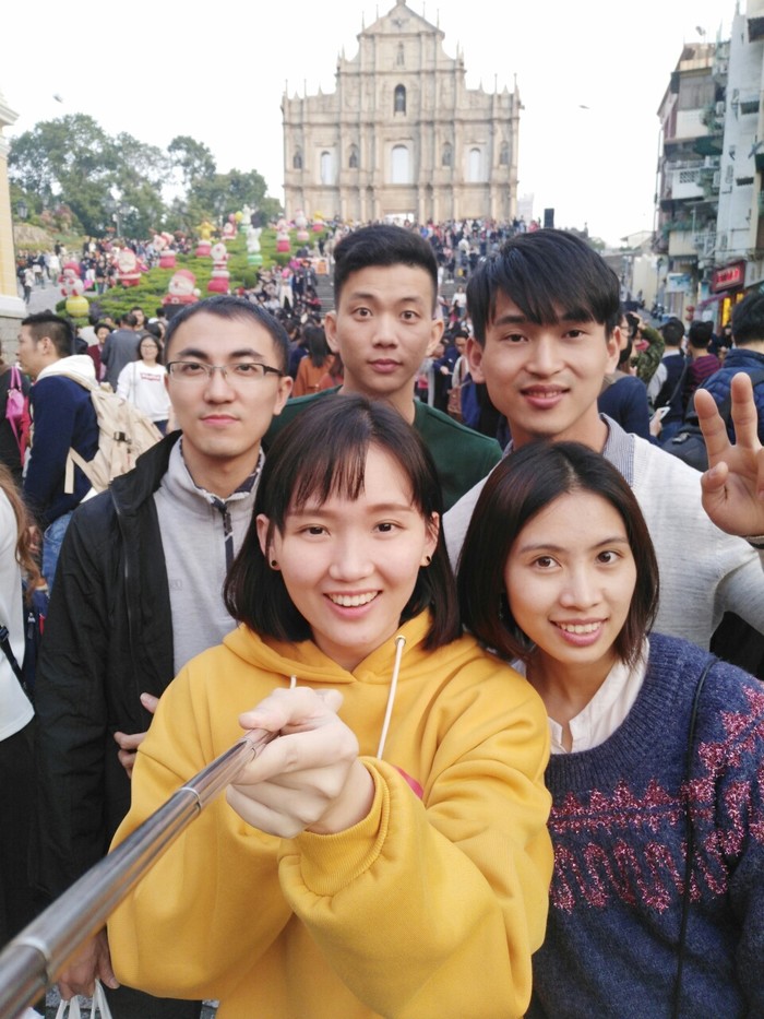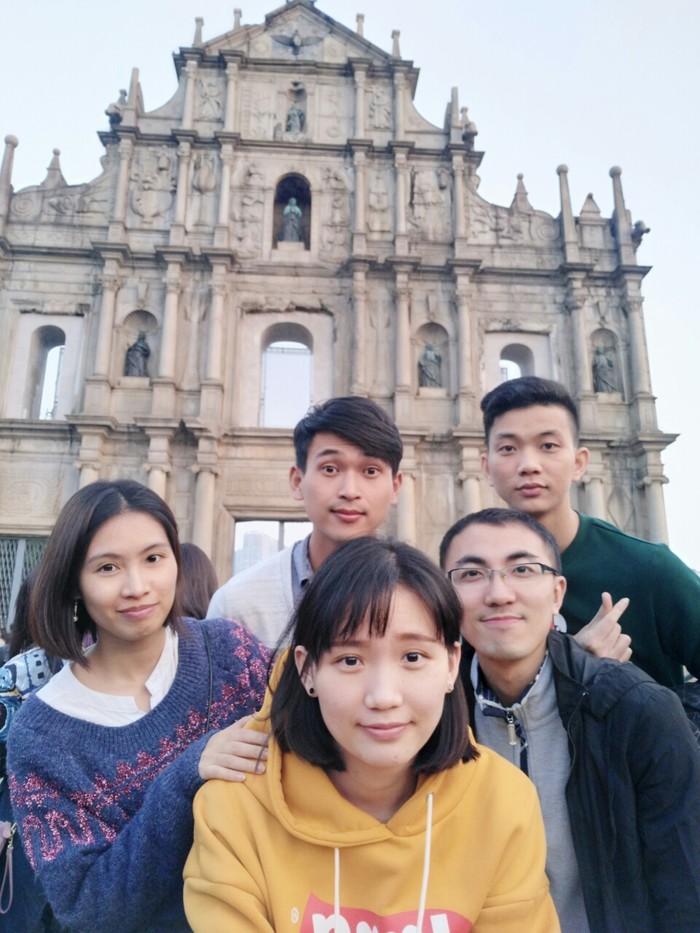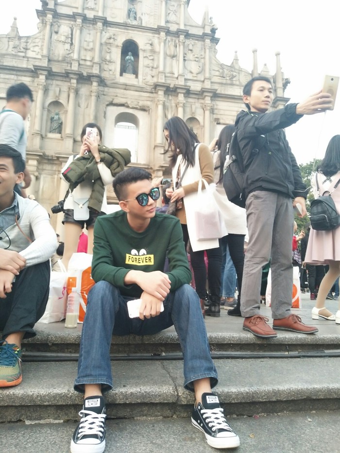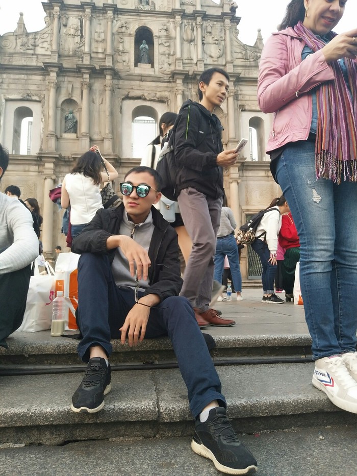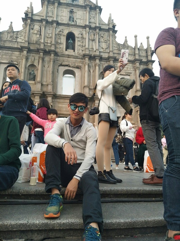逛完小吃街,我们在路口寻找兑换澳币的地方,我与导游佩在路口座椅等着,后来世杰也一起坐着等,明文兄和国怡出发找兑换点,换到纸币就乘坐公交车出发大三巴牌坊~