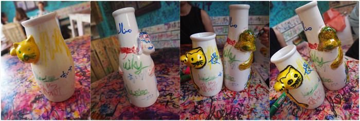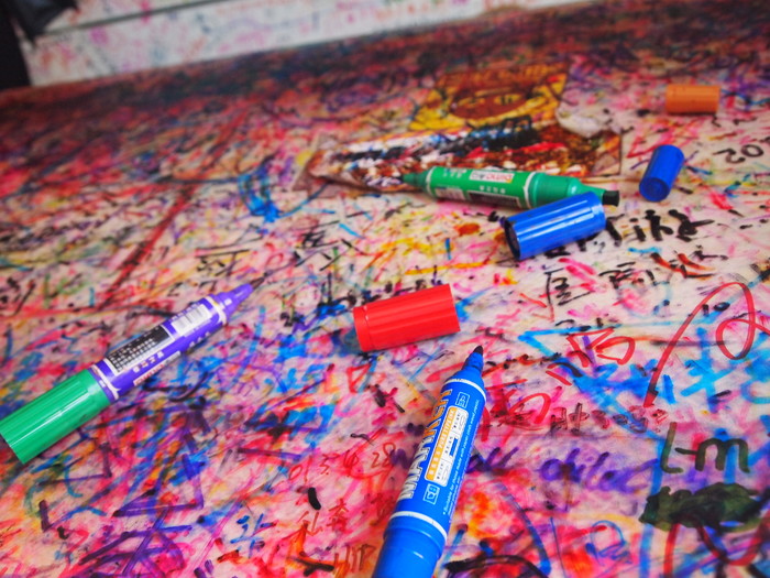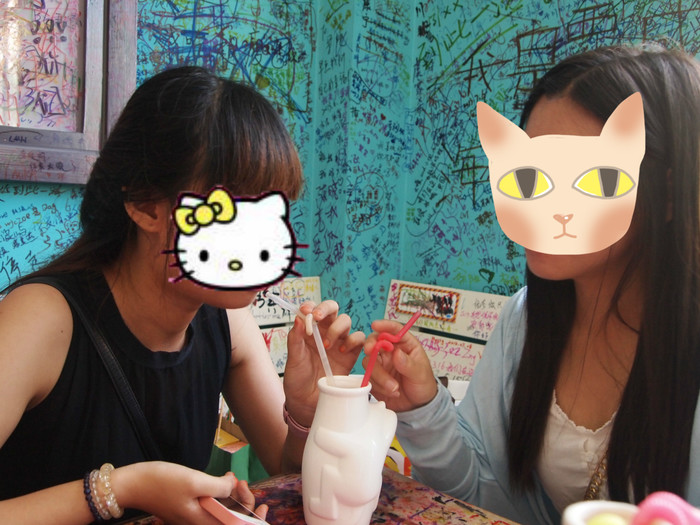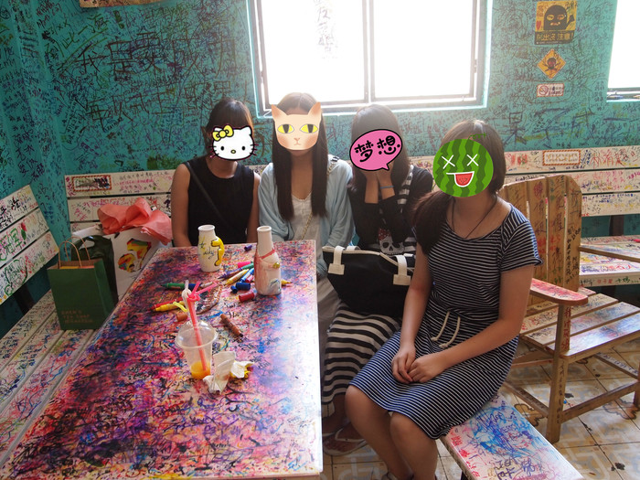“邂逅”这间店买奶茶会送一个白色的凹凸陶瓷杯,杯子是可以带走的,里面有色彩笔给你涂杯子,屋子里面全被人画满了各种涂鸦和名字。