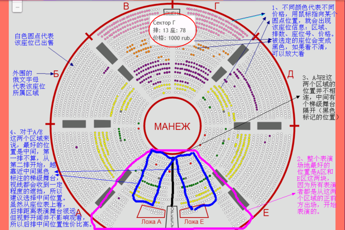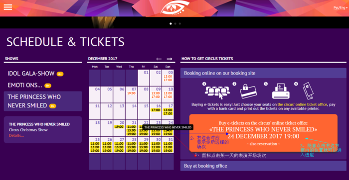 通过官网,查询到演出的场次,根据自己行程来选择,这个官网网址跟之前我在旅行预订网攻略找到的不一样,应该是更新了,我已经购买并成功观看过,确认无误,而且现在官网增加了中文,毫无难度购票。可以分享一下选择马戏团位置的心得,当你选择了场次以后,就可以看到表演场地的座位图,让你选择位置购票,该选哪个位置,一开始实在是眼花缭乱,从网页上搜索了很多资料,我才做的决定,分享给大家: