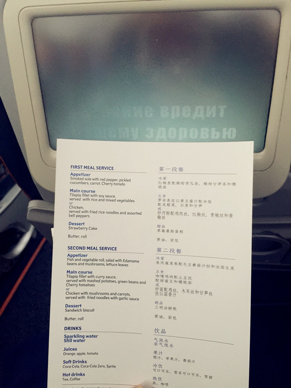 如果要吐槽的,那应该就是俄航的餐食不好吃,这个前面有说过,再有就是飞机座位上的多媒体不太好使,按钮反应很慢,不过影片还是挺新的。长途航班都会给你派发一张餐单,上面写着供应什么餐点,光看餐单,感觉还不错,等你拿到实物后,就。。。呵呵。。给你们看看感受一下吧。