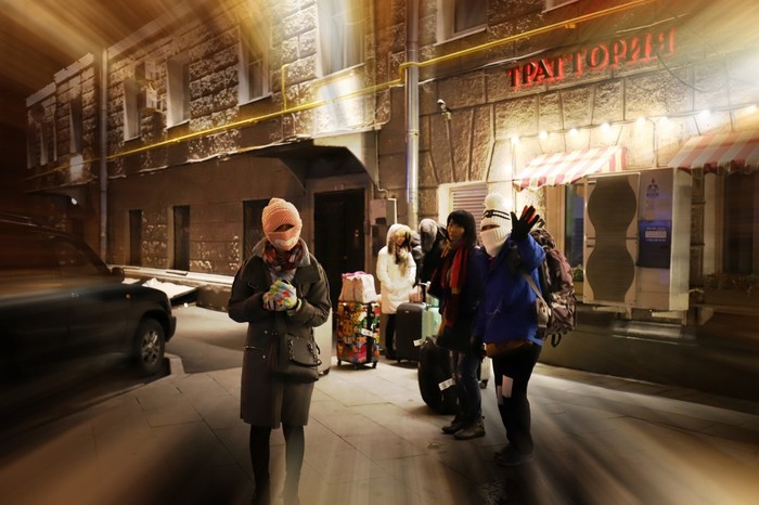 从SVO机场到市区还挺远,差不多一个半小时,最最烦人的是堵车,刚出机场就开始堵,再加上司机大叔是个戴老花镜的老筒子,他半句英文都不懂,实在难沟通,而且还找不着路,最后没办法,打给对接人让他直接跟司机沟通,磨磨蹭蹭快21点才到的公寓附近,对接人约我们在公寓附近的一家餐厅门口等,刚从机场出来还不觉得冷,下了车,在寒风中等待的过程中,才是一整天最煎熬的。