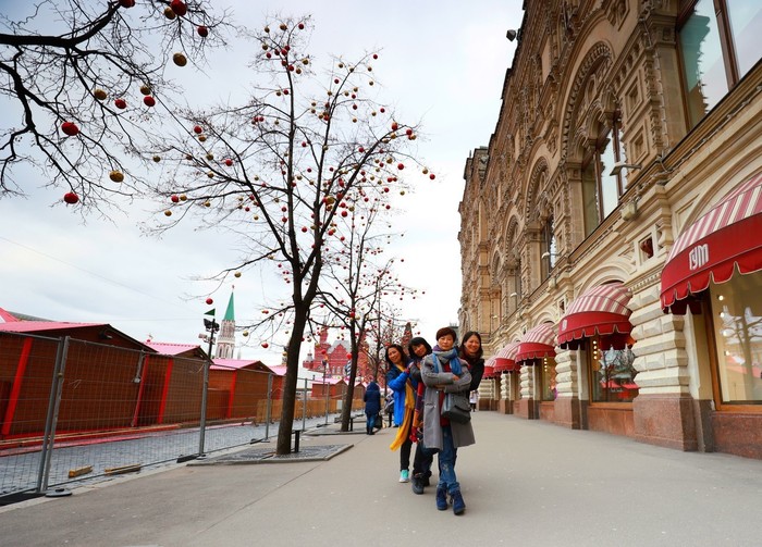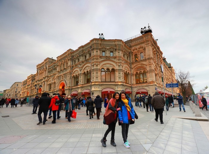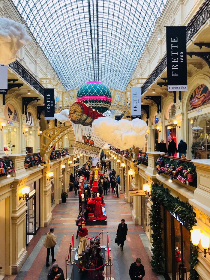 古姆商场就在圣瓦西里升天教堂前面,往红场方向靠右侧走就能看见,在列宁墓对面。本来在古姆商场和列宁墓中间的广场充分能拍出全景,但我们到的那天发现周围都正在施工,似乎是为了圣诞节做准备。古姆与其说它是商店,不如说它更像宫殿,极具欧洲古典风格的米黄色建筑和旁边色彩瑰丽的教堂和谐地组成红场上一道亮丽的风景。古姆是一座玻璃屋顶的三层建筑,有三个大拱门,既有俄罗斯特色的瓷器、工艺品、服装、百货等精品,又荟萃了琳琅满目的进口商品。从观光的角度来看不错,但从购物的角度,我觉得就没有什么吸引力了,基本都是大品牌的商品,只是在一楼过道已经布置了圣诞树,正在销售当地特色的糖果等小食品。