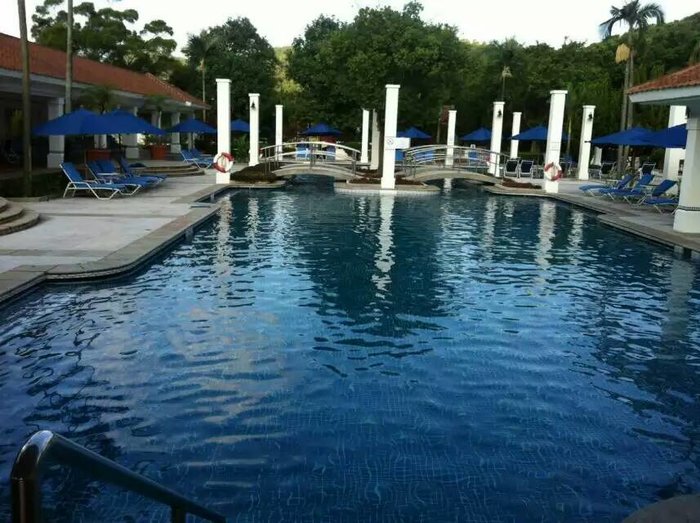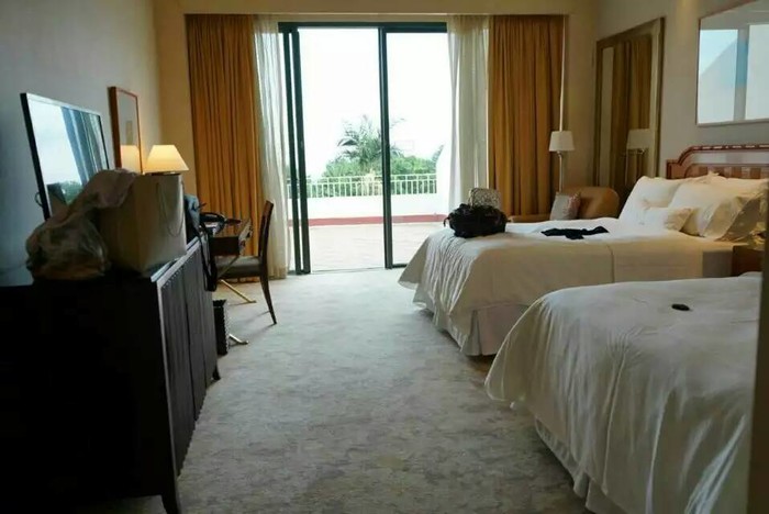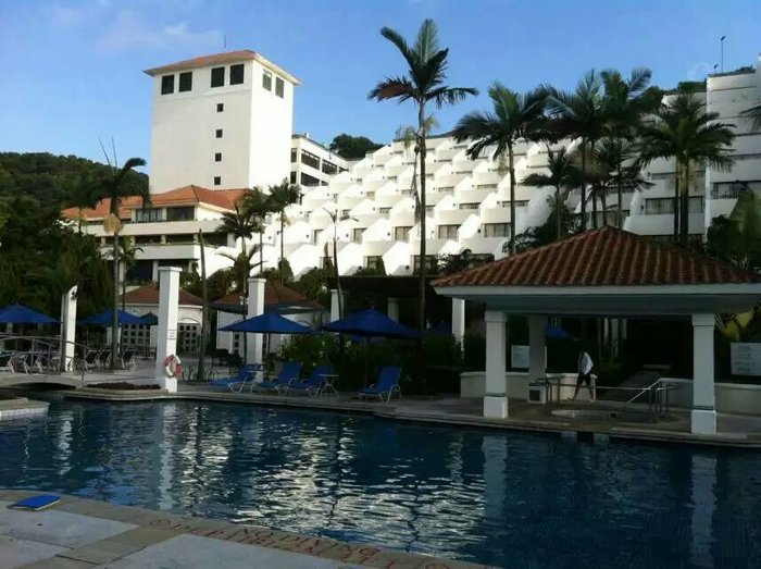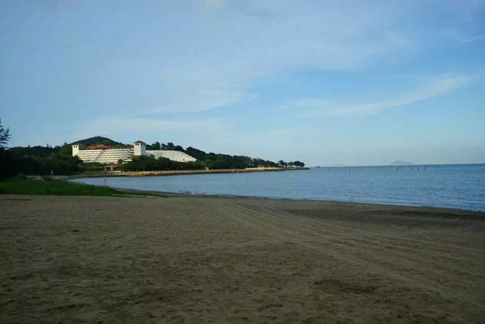 沙滩另外一头的白色房屋就是我们订的酒店---澳门鹭环海天度假酒店,可以走沙滩上去。酒店挺好的,床很软,下面有个小花园,有室内和室外游泳池,室外泳池对出就是海岸了(可以直接走出去),回赌场可以预约坐酒店免费班车出去。