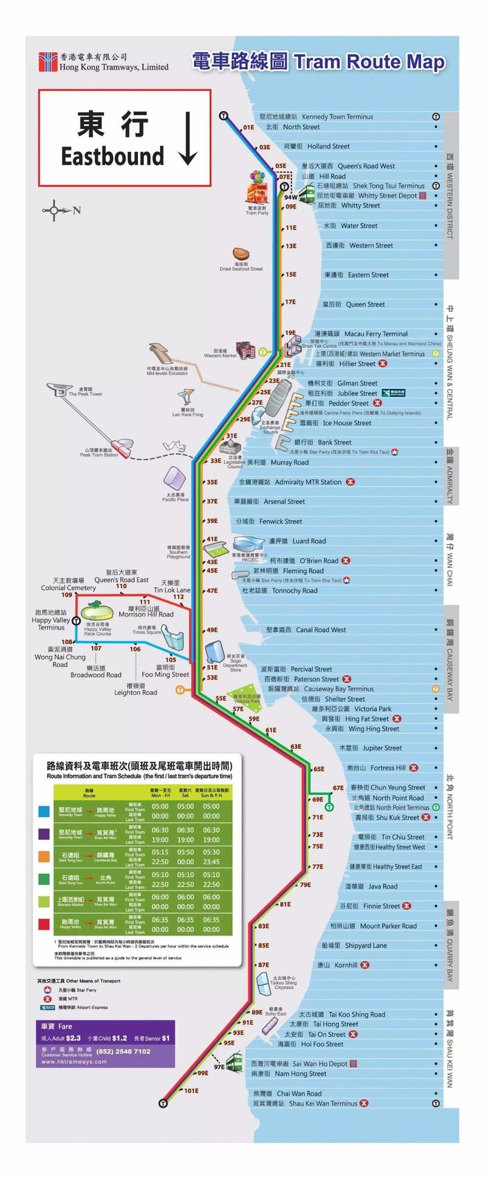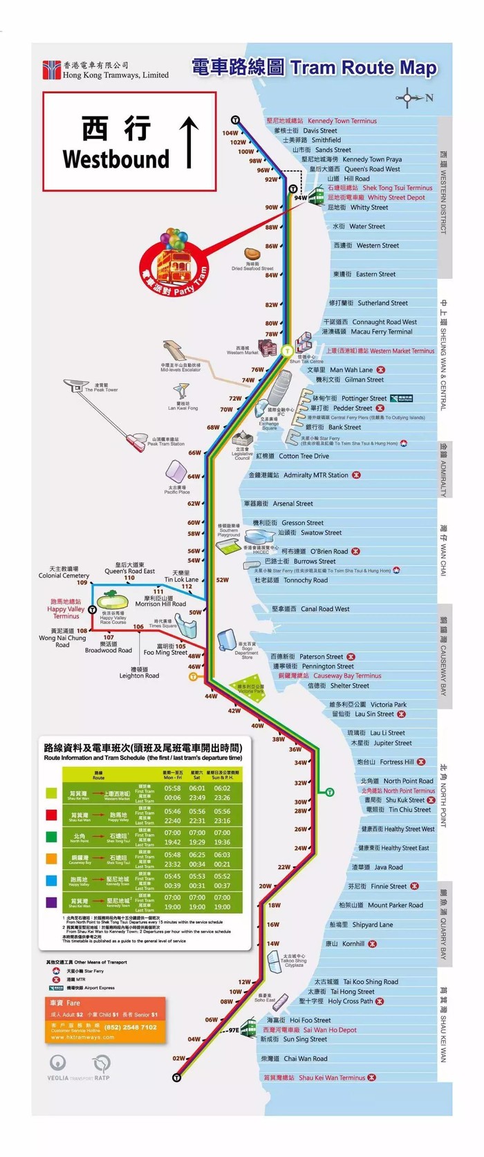 7、叮叮车,刷八达通,后门刷卡上车,前门刷卡下车,google maps 可以查,看下图你上下车站经过路线的颜色,对应去往方向的总站,叮叮车牌会写总站站名和车身对应的颜色。